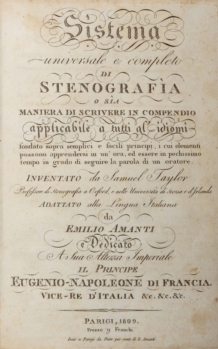 Universal and complete system of shorthand or a way of writing in abridged version applicable to all languages founded on simple and easy principles, the elements of which can be learned in an hour, and in a very short time be able to follow the word of an orator invented by Samuel Taylor., 1809