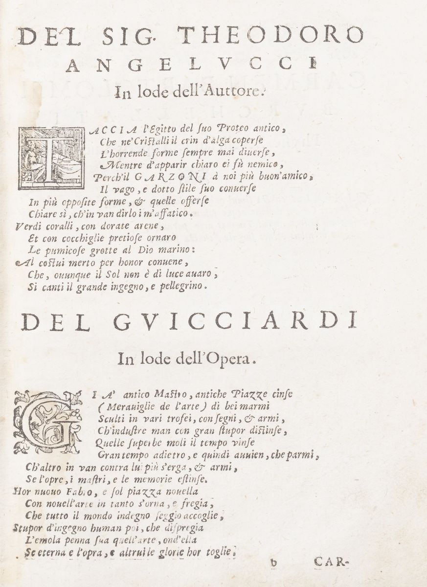 Venice, Giorgio Valentini and Antonio Giuliani, 1617. In 4th. Typographic brand engraved in wood on the title page, woodcut initials and friezes, slight water mark on the internal white margin of the first issues, some slight foxing and reddening, rare small ink stains, coeval parchment binding, handwritten title on the spine, gaps on the spine, signs of wear on the hinges, minor defects. Ownership signature on title page.