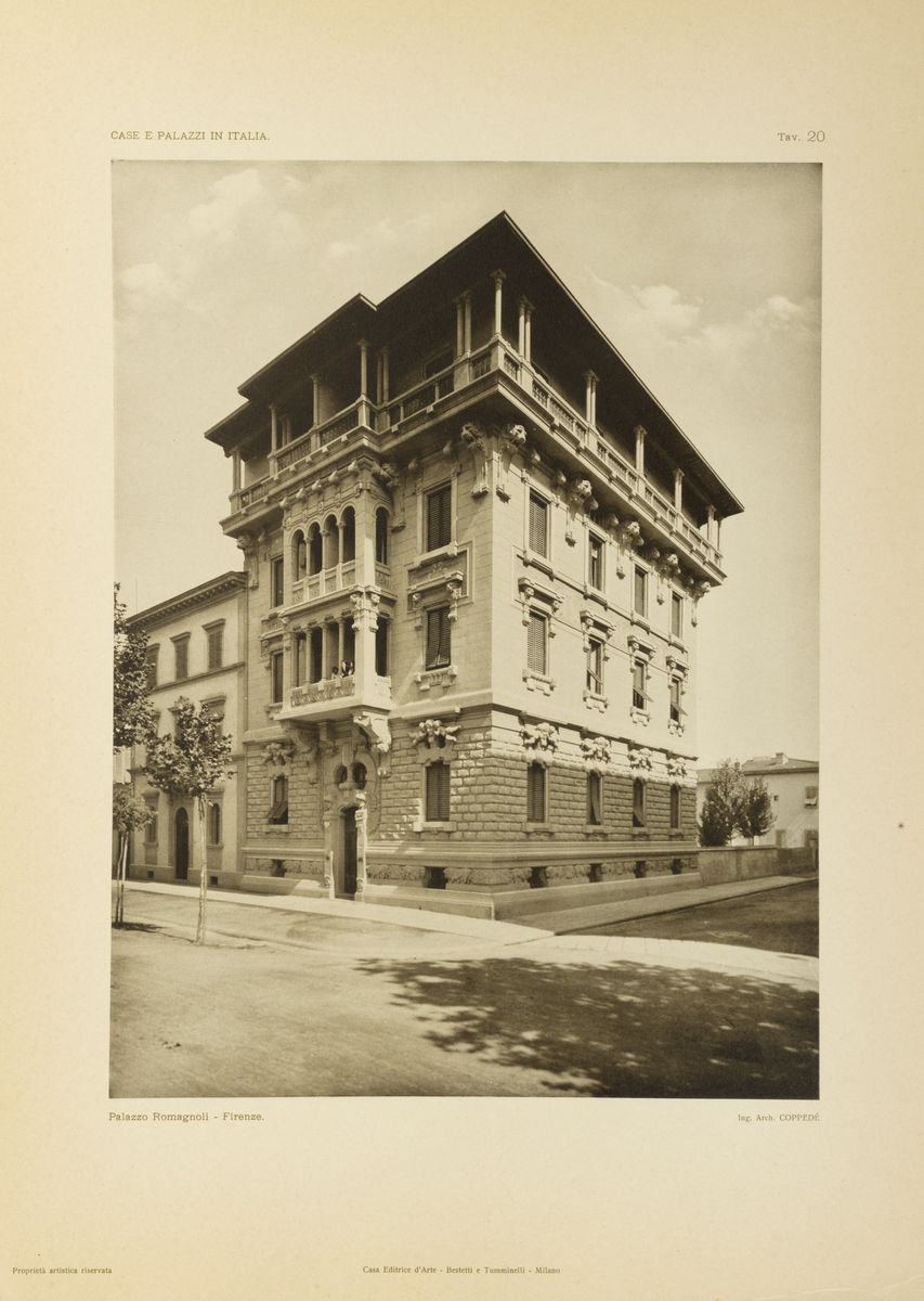 Milan, Bestetti and Tumminelli, [beginning of sec. XX]. In foil, title page and 50 phototype plates depicting important buildings in Italian cities (one foreign): Milan (to which the majority is dedicated of the tables), Rome, Viareggio, Genoa, Florence, Nice. Each plate has its own caption showing the place and the name of the architect, slight defects, cloth editorial folder with closing strings, title in red on the spine and on the plate.
