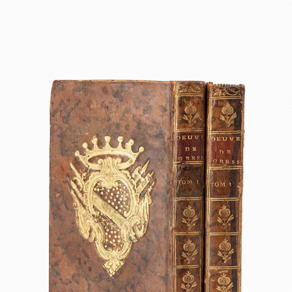London, E. Kelmarneck, 1748. In 8th. 2 vols. frieze on the title pages, typographical headpieces, contemporary bindings in marbled brown calfskin, in the center of the plates unidentified arms embossed in gold, red edges. slight defects. Stamp noble on the title pages.