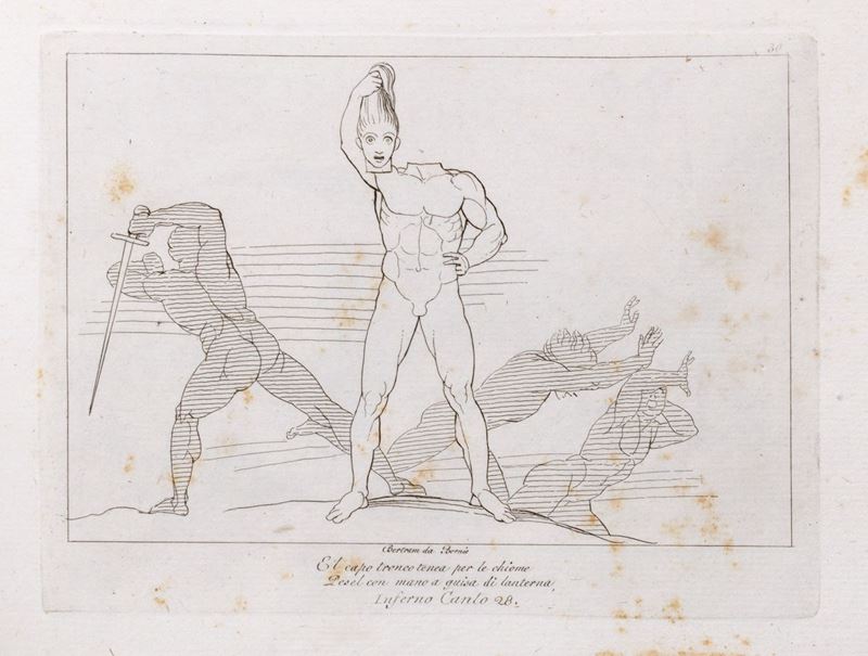 At the request of the young Dutch banker Thomas Hope, the English draftsman and sculptor John Flaxman (York 1755-London 1826) agreed to execute the illustrations of the Divine Comedy for a fee of three guineas each. During his Italian stay, in which he was dedicated to the study of ancient art, between 1787 and 1794 he created the tables with his essential and linear graphic style, outlining the human figures and strong personalities with a few precise strokes. Flaxman's wife wrote in a letter that Dante's illustrations “are drawn with simple lines, no Shadow, & treated in the beautiful Gothic taste with the Sentiment of the Poet & Artist united”