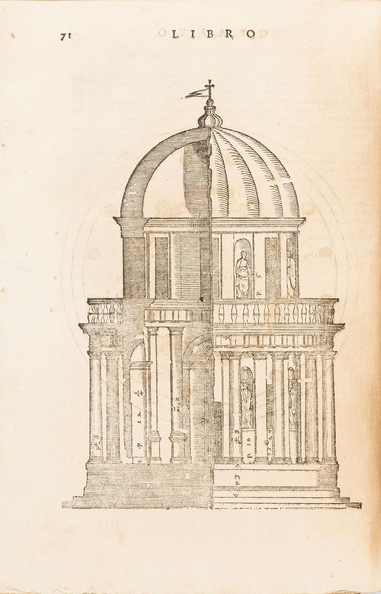 Last Italian reprint, following those of 1581, 1601 and 1616, in which the original wooden matrices of the Quattro libri dell'architettura published in Venice in 1570 for Domenico de' Franceschi are reused. For this edition a new intaglio title page was created which takes up the design and replaces the woodcut used for the original title page.