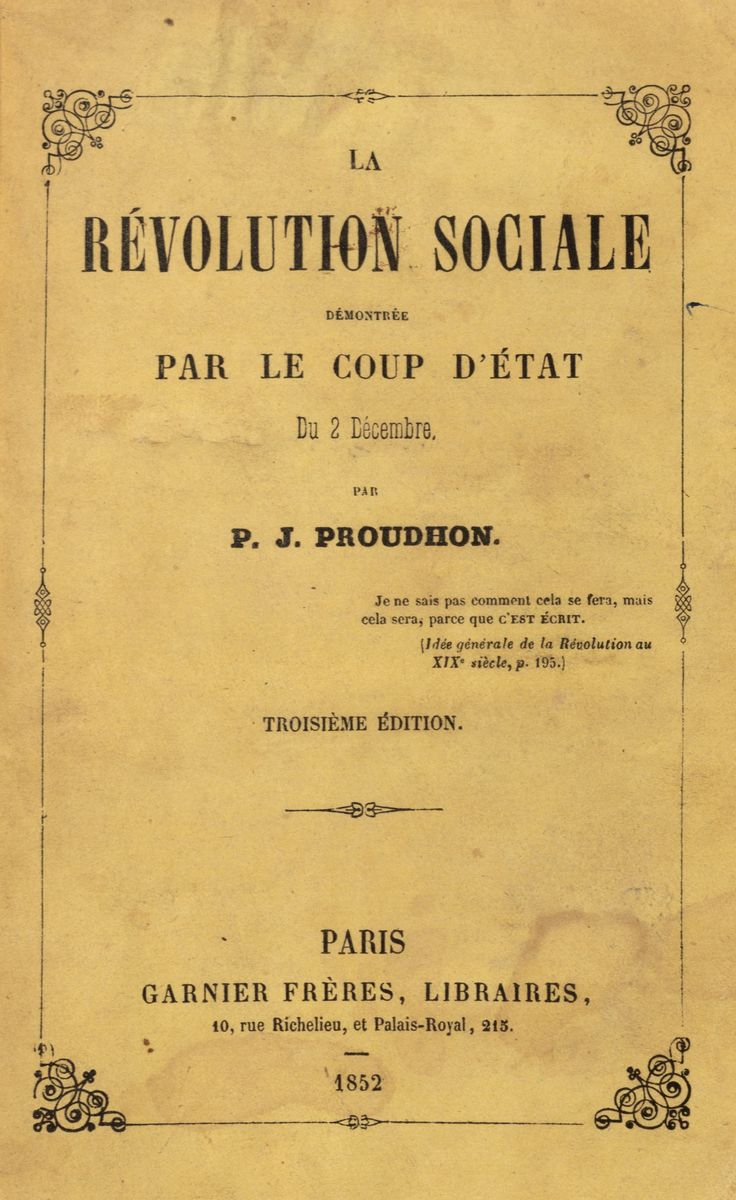 Paris, E. Dentu, 1865. In 16th. Example in beards, pp. 1-4 missing, paperback in a later binding in half red morocco with corners and marbled paper, author and title embossed in gold on the spine with 5 raised bands, minor defects. On the front cover of the paperback embossed stamp "Marsigli e Rocchi Bologna". § By the same author  ;La Révolution sociale démontrée par le coup d'état du 2 décembre, Paris, Garnier, 1852. Copy in beards, paperback in a modern cloth binding, title in gold within a label on the spine, stains on the back cover of the paperback.< /p>