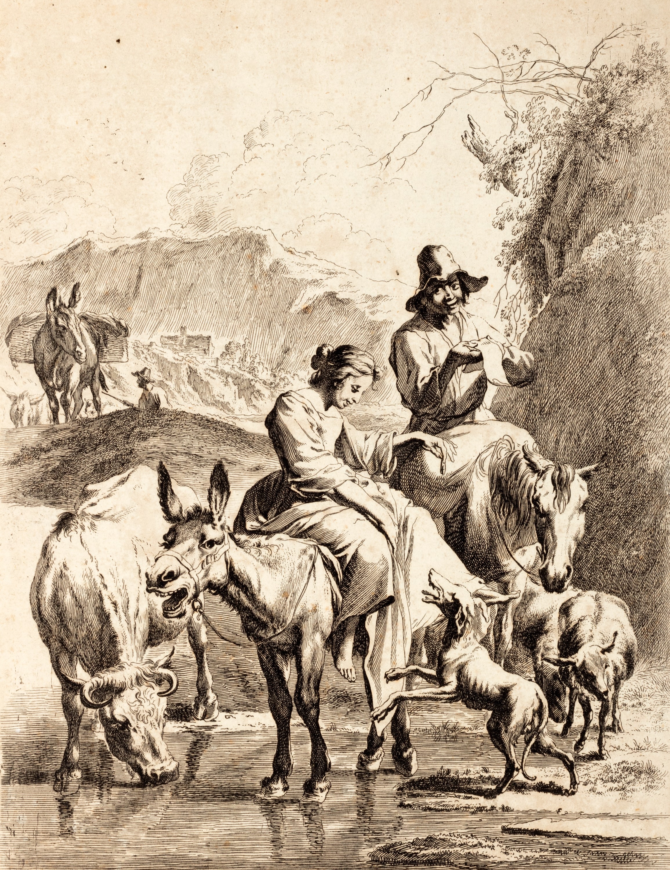 Suite of 5 copperplate engravings, including title page, mm. 13 x12 about, glue on vintage cardboard rear; together with 6 other engravings of larger format, which depict scenes bucolic with farmers, donkeys, and other animals, other etching engraved by Vischer and drawn by Berghem.