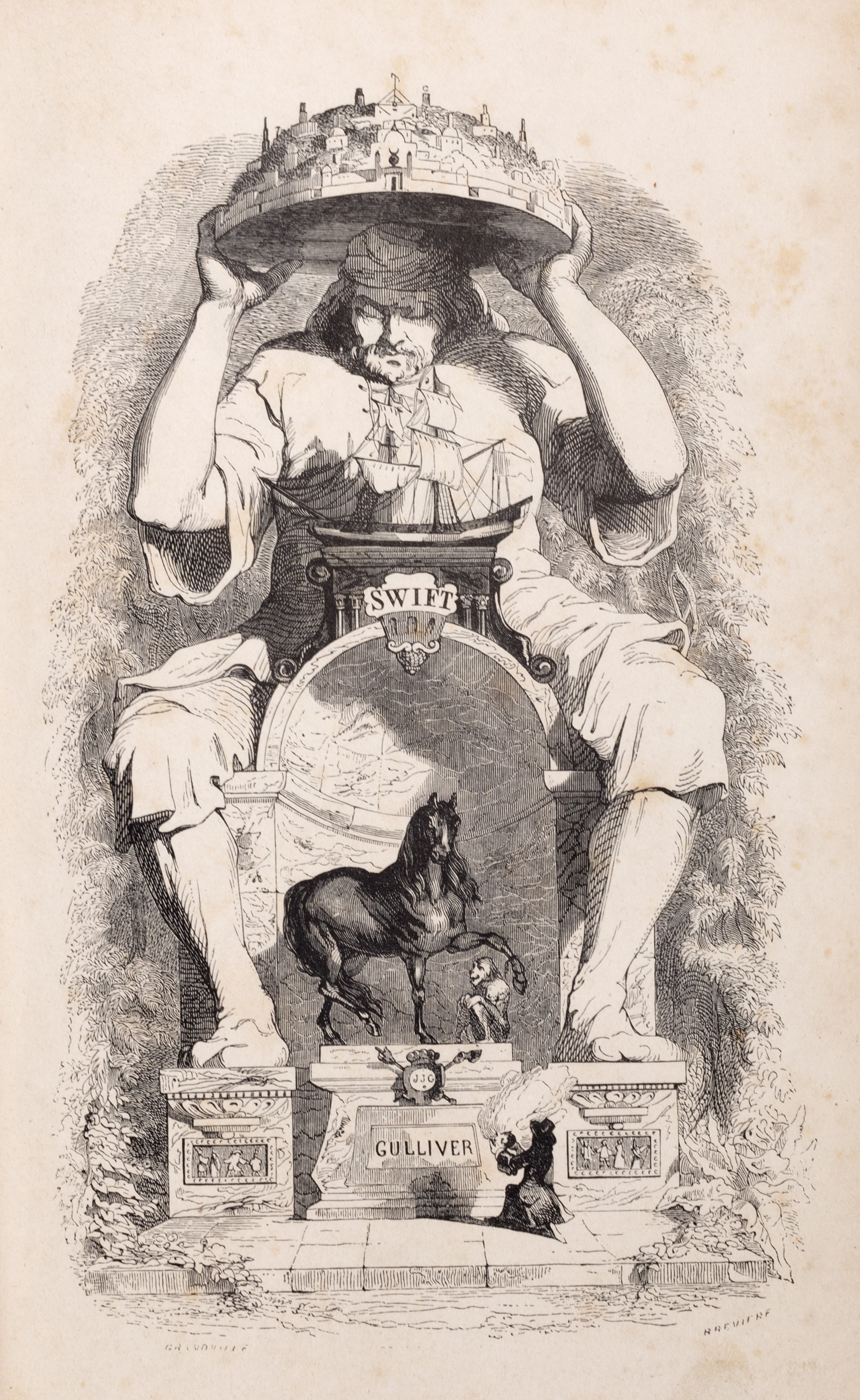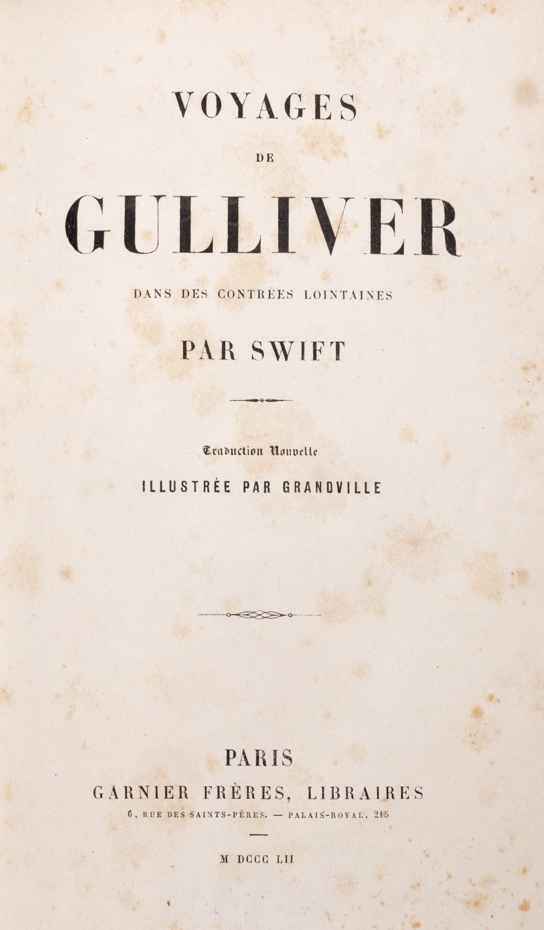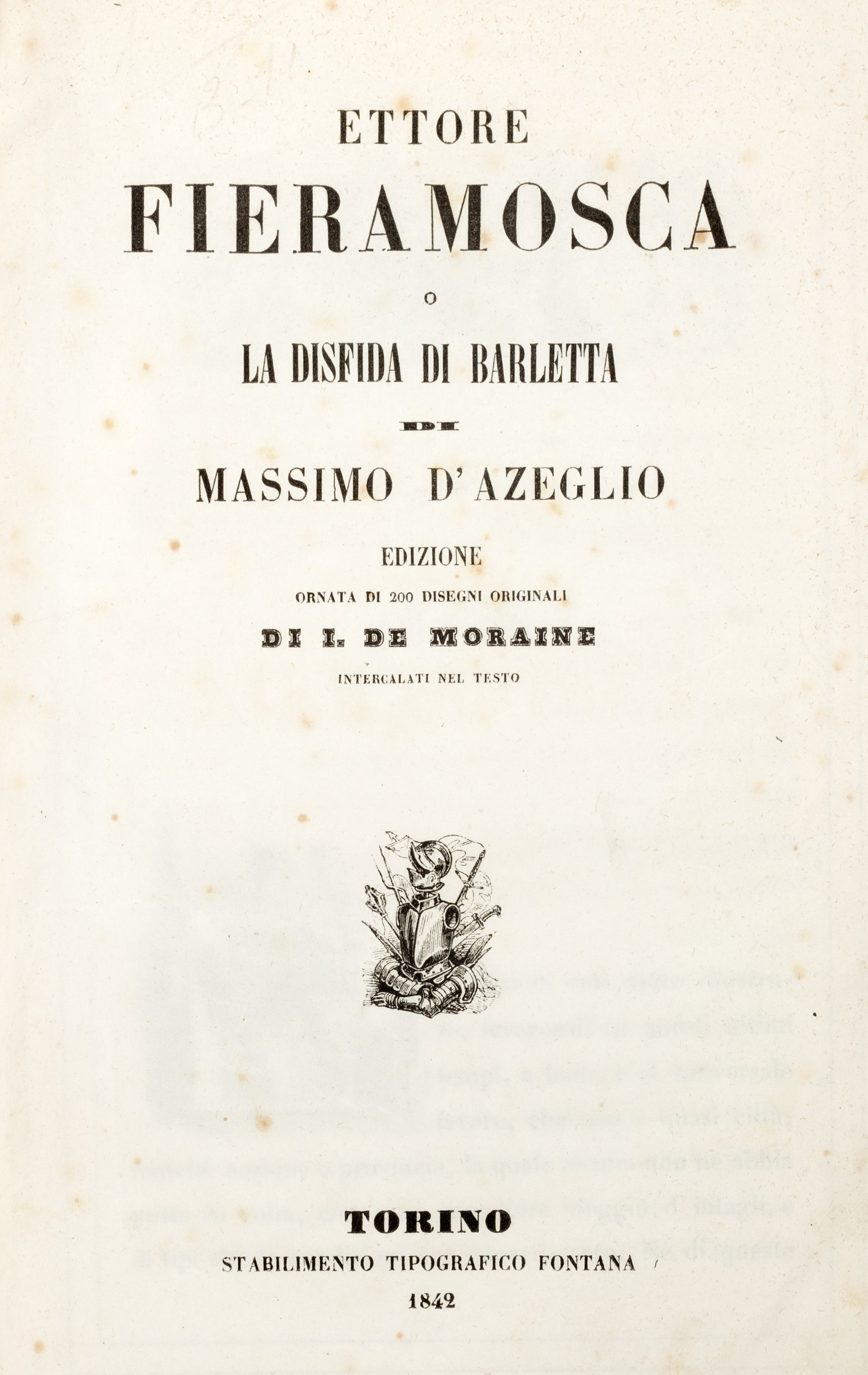 Paris, Tallone, 1949. In 8°. Some rare foxing, editorial cover in cardboard within a half morocco binding and marbled paper. Paper ex libris on the back cover. Sample no. 247 of 575. § Together in the lot Swift, Jonathan, Voyages de Gulliver, Paris, Garnier, 1852 and D'Azeglio, Massimo, < i>Ettore Fieramosca or the challenge of Barletta, Turin, Fontana Typographic Establishment, 1842.
