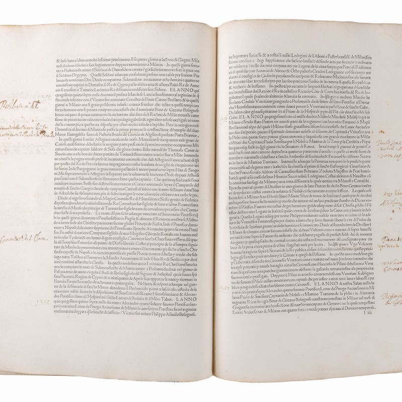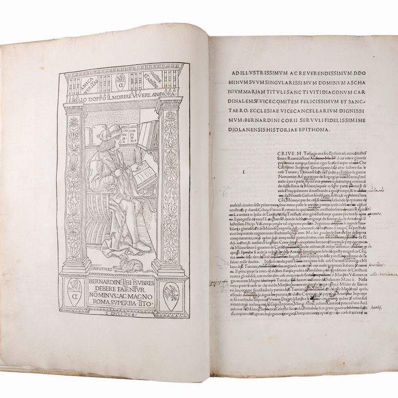 "(...) The Historia, in fact, even if it has a title in Latin, is written in the vernacular.vernacular neither clear nor fluent, which presents latin-like constructions, reminiscences of Petrarch and Lombardisms: a language with the defects and forcings typical of non-Tuscan vernaculars before del Bembo. The style of C., "monotonous and rough" for De Magri and "pictorial and very lively" for Curto, can be considered the obligatory result of his effort to give life to a prose that had the solemnity of Latin, the naturalness of the Tuscan, the immediacy of the spoken language and which could only oscillate between these poles.C.'s choice to write in the vernacular had perhaps been prepared by the vernacular translations that had been favored in the Milanese court, such as those that Decembrio produced for Filippo Maria Visconti and Cristoforo Landìno for il Moro (...)" (Treccani, sub vocis). The peculiarity of this copy is the dense linguistic, lexical, morphological and interpunctual revision that the first 34 pp. undergo, a revision of such extension and depth as to suggest a direct intervention by the same author, if not by his own hand perhaps through the help of one of his secretary. Corio died just one year after the publication of the volume and it cannot be excluded that he decided to revise his text. The abrupt termination of the review could attest to the sudden death of the author. If, on the other hand, a subsequent, later hand is hypothesized, then the field of hypotheses widens considerably. Whoever amends the text is well aware of the trends that the Italian vernacular was taking in early sixteenth-century Italy, and tries to cleanse Corio's text of the more strongly Lombard forms. In the two subsequent editions, of 1554 and 1565, a linguistic and syntactic revision of the text was made, but it differs from the present lesson, which is therefore ATTESTED ONLY BY THE PRESENT WITNESS. Everything to study.