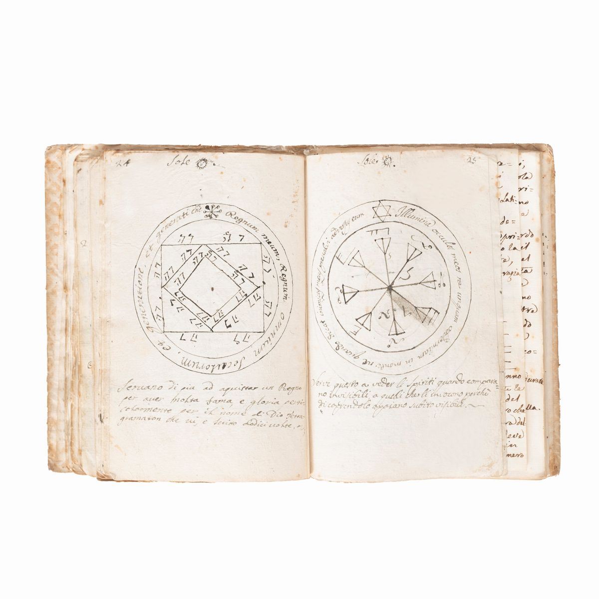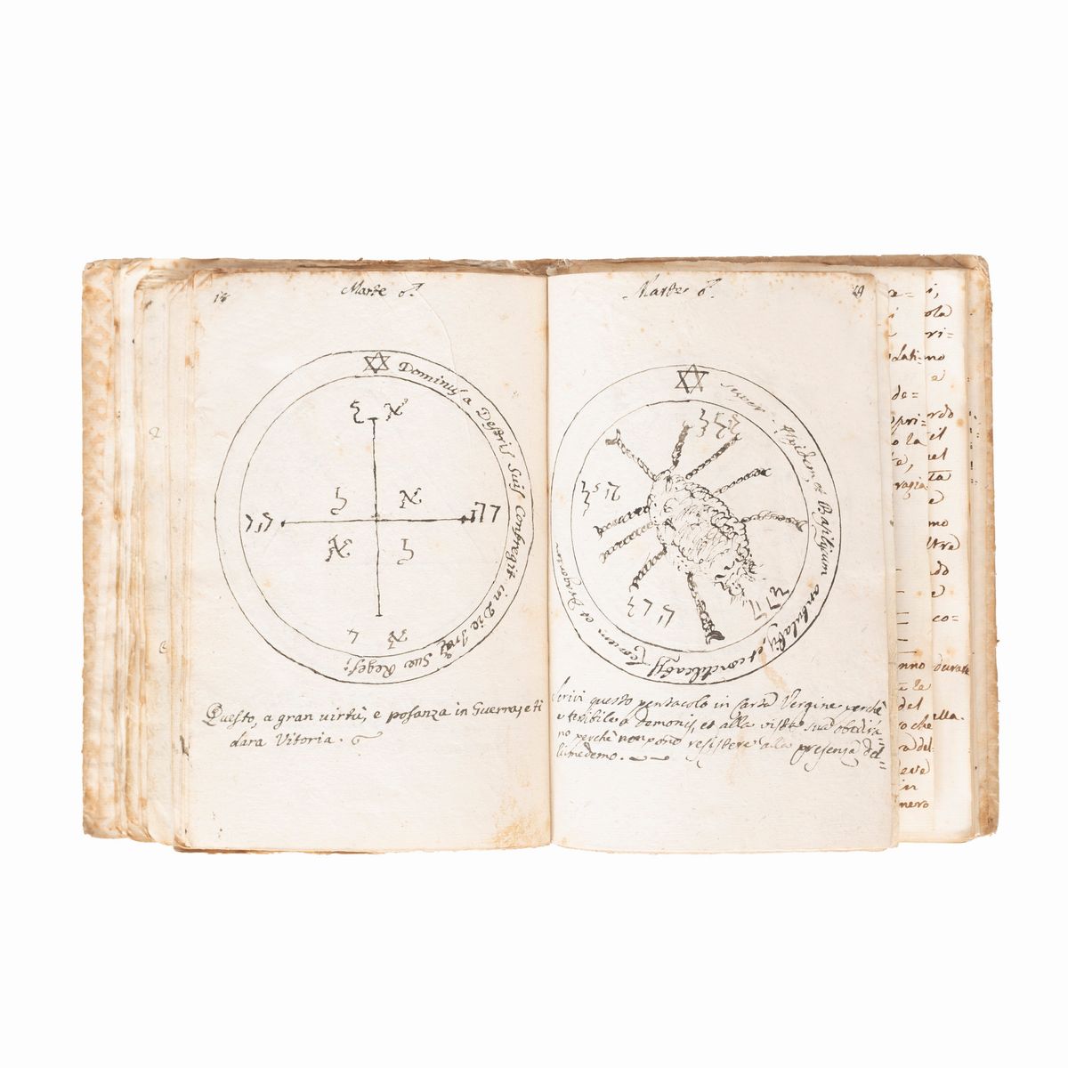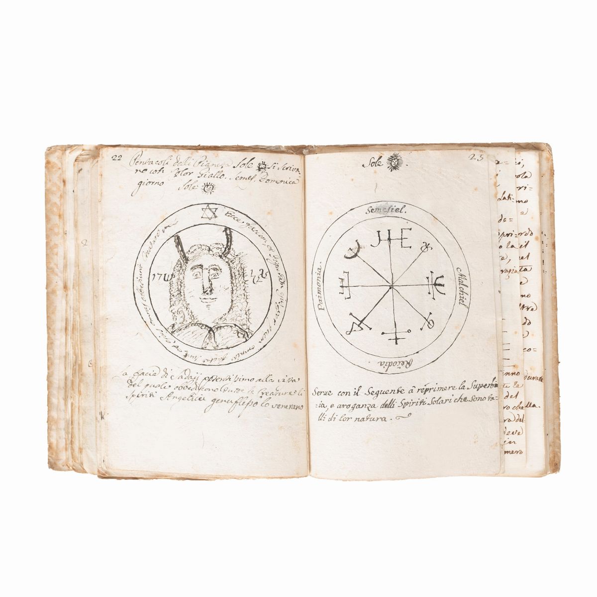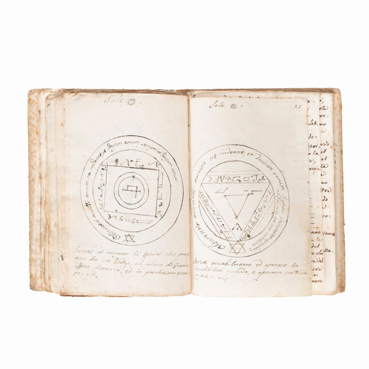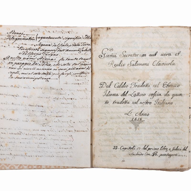In the 16th-18th century several texts circulated under the name of Key of Solomon, or Clavicula Salomonis, based on the medieval tradition that King Solomon knew how to control demons and get them to do his bidding, and he recorded this secret knowledge for his son Rehoboam. Solomon's mastery of demons is a common element in later Jewish and Arab legends and is often attributed to his possession of a magical ring called the Seal of Solomon. The Clavicle Salomonis, the original of which according to tradition was in Hebrew, is today attested in the world by about 35 copies in various languages including Latin, Italian, French, English, Czech and German. There are very few known copies in Italian, all dating back to the end of the 17th century and mostly to the 18th-19th century.The copies that appeared at auction were very rare, the last - less illustrated than the present - at Christie's London, 15 December 2021, lot 79, sold for £ 8750.< /div>