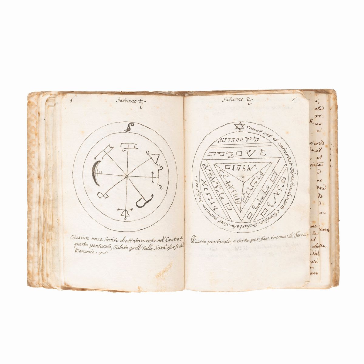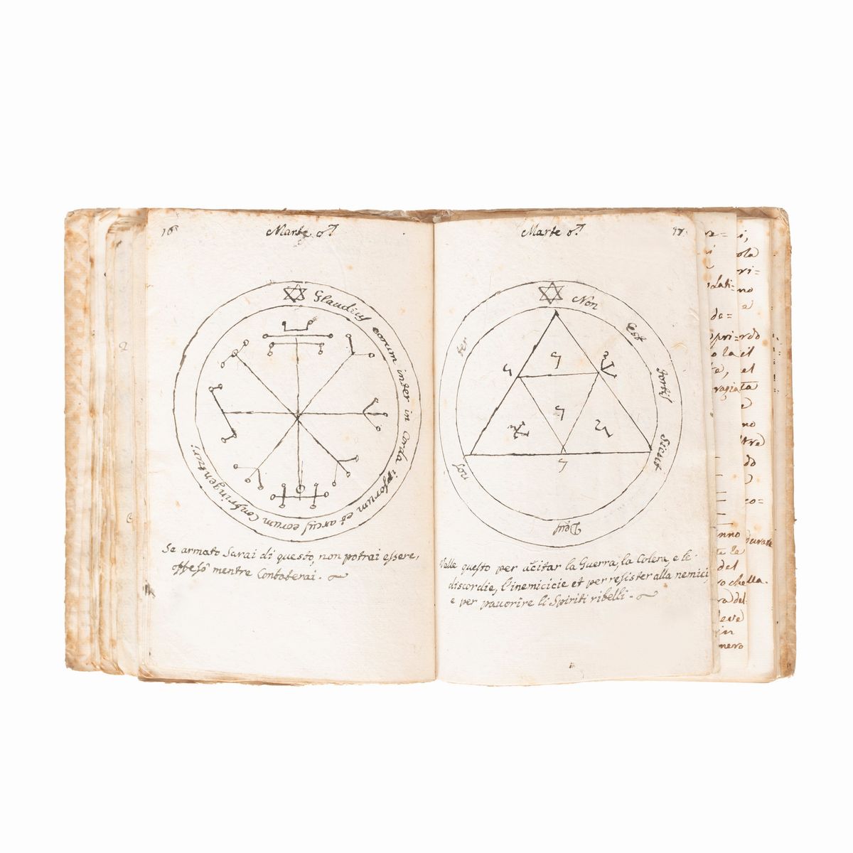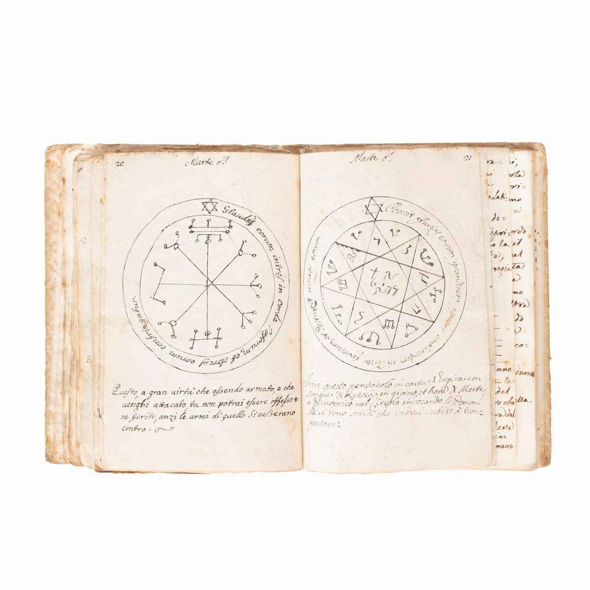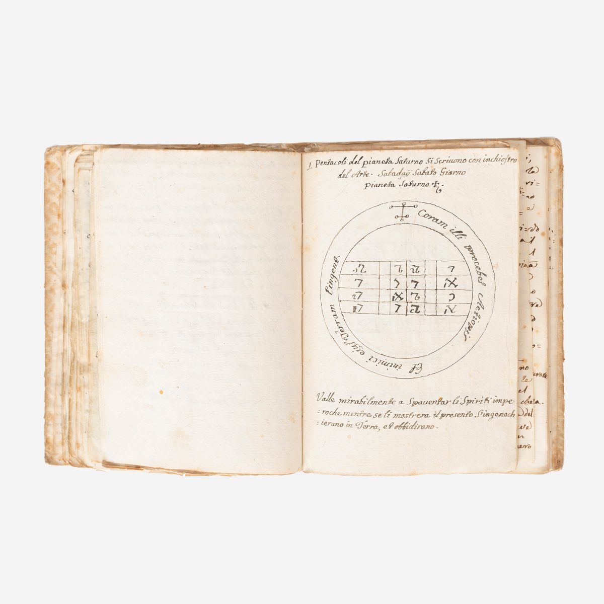In the 16th-18th century several texts circulated under the name of Key of Solomon, or Clavicula Salomonis, based on the medieval tradition that King Solomon knew how to control demons and get them to do his bidding, and he recorded this secret knowledge for his son Rehoboam. Solomon's mastery of demons is a common element in later Jewish and Arab legends and is often attributed to his possession of a magical ring called the Seal of Solomon. The Clavicle Salomonis, the original of which according to tradition was in Hebrew, is today attested in the world by about 35 copies in various languages including Latin, Italian, French, English, Czech and German. There are very few known copies in Italian, all dating back to the end of the 17th century and mostly to the 18th-19th century.The copies that appeared at auction were very rare, the last - less illustrated than the present - at Christie's London, 15 December 2021, lot 79, sold for £ 8750.< /div>