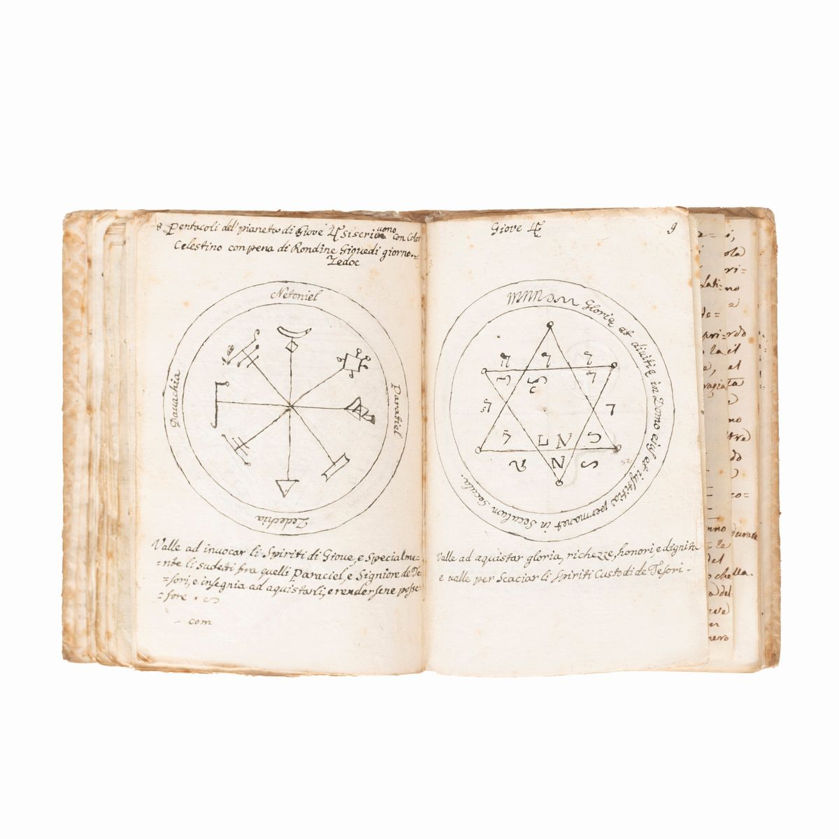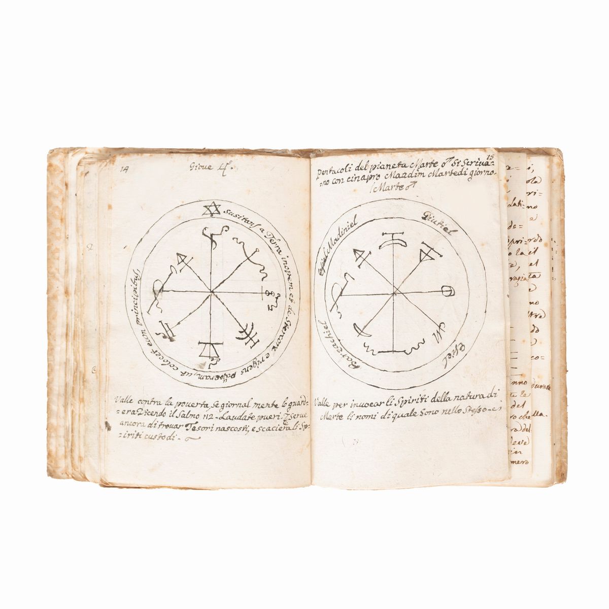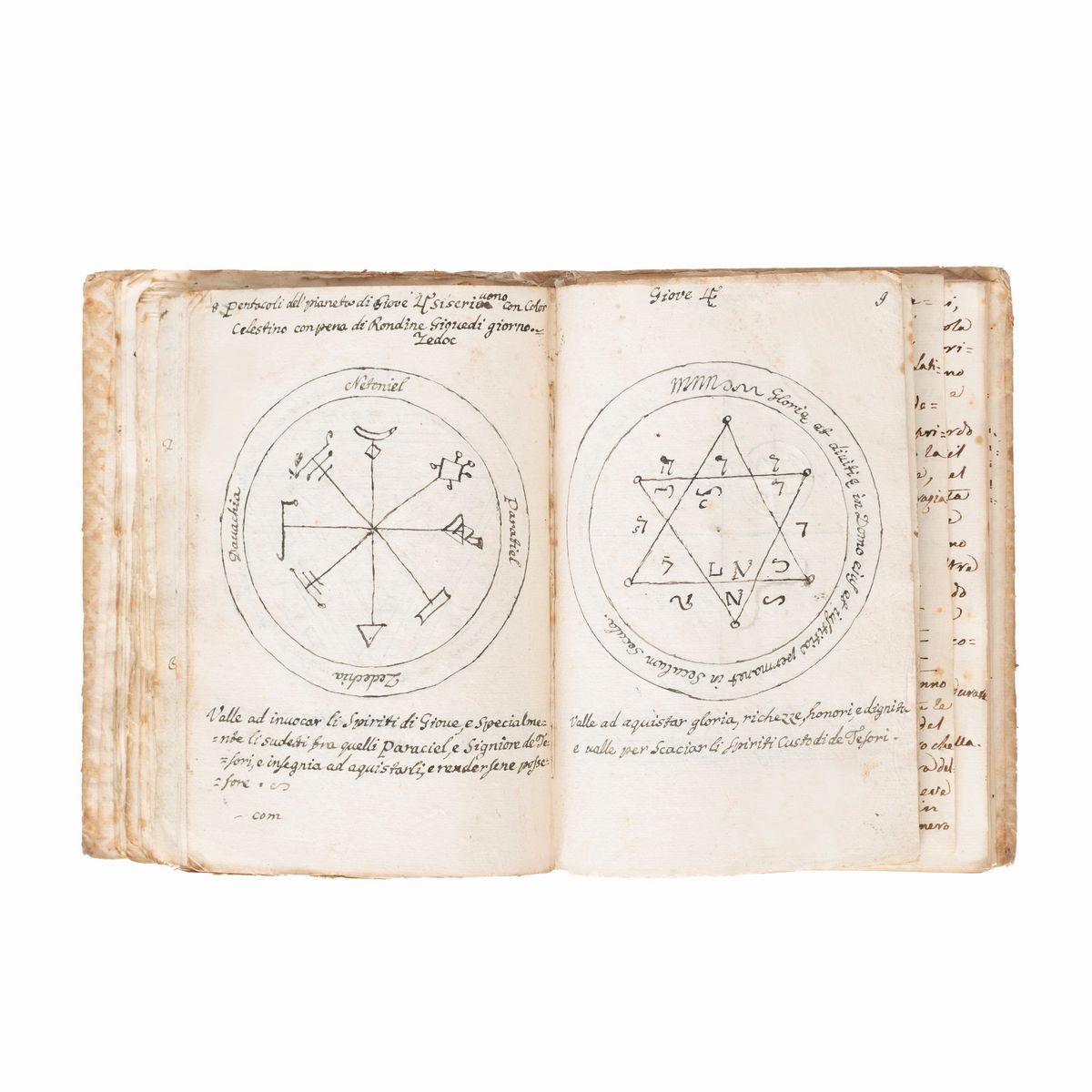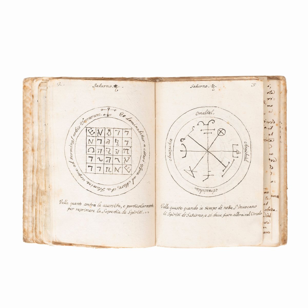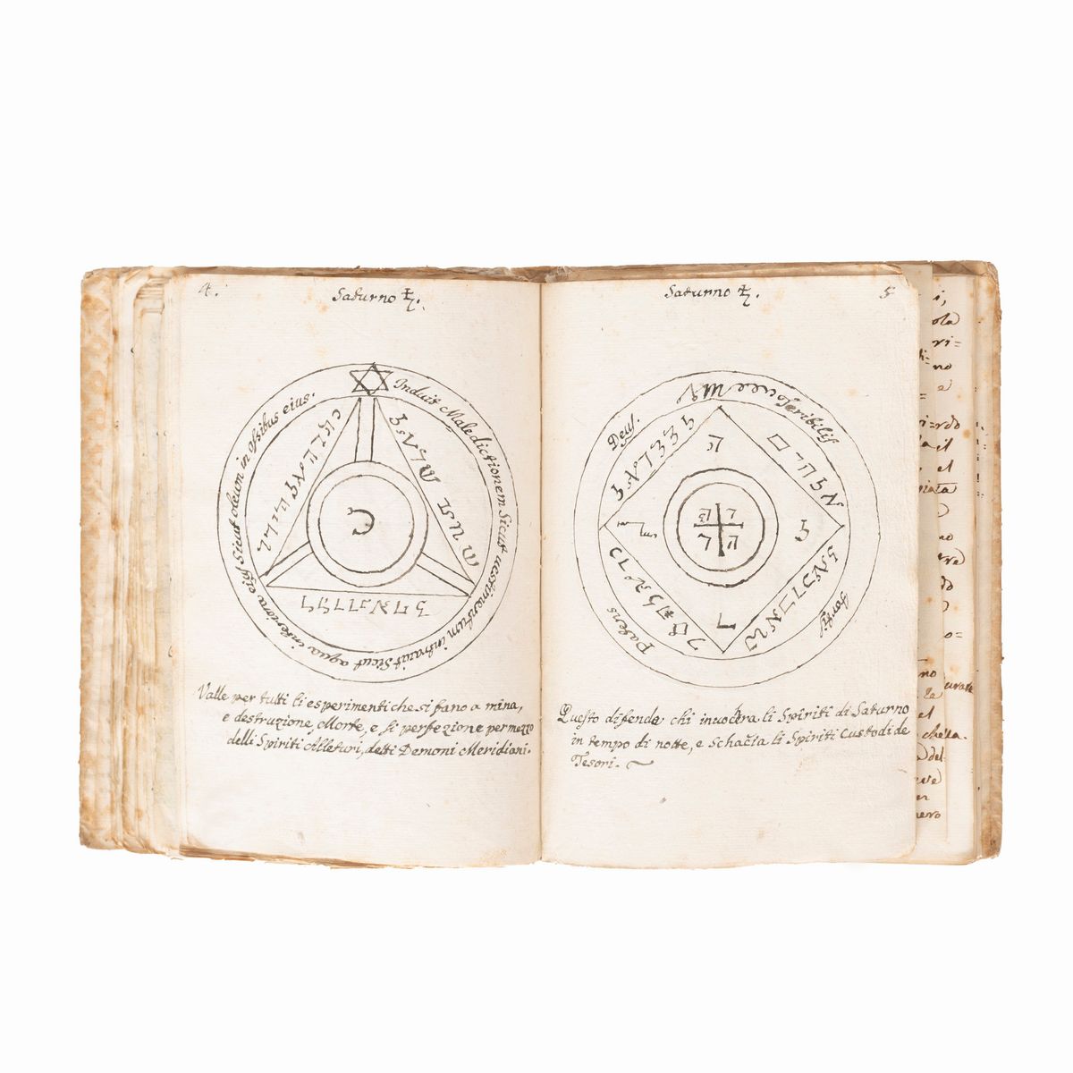 In the 16th-18th century several texts circulated under the name of Key of Solomon, or Clavicula Salomonis, based on the medieval tradition that King Solomon knew how to control demons and get them to do his bidding, and he recorded this secret knowledge for his son Rehoboam. Solomon's mastery of demons is a common element in later Jewish and Arab legends and is often attributed to his possession of a magical ring called the Seal of Solomon. The Clavicle Salomonis, the original of which according to tradition was in Hebrew, is today attested in the world by about 35 copies in various languages including Latin, Italian, French, English, Czech and German. There are very few known copies in Italian, all dating back to the end of the 17th century and mostly to the 18th-19th century.The copies that appeared at auction were very rare, the last - less illustrated than the present - at Christie's London, 15 December 2021, lot 79, sold for £ 8750.< /div>