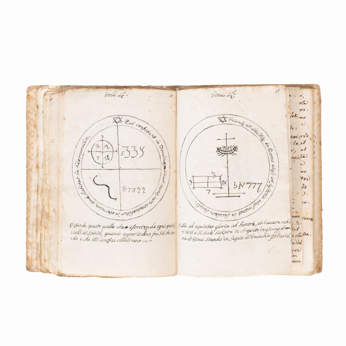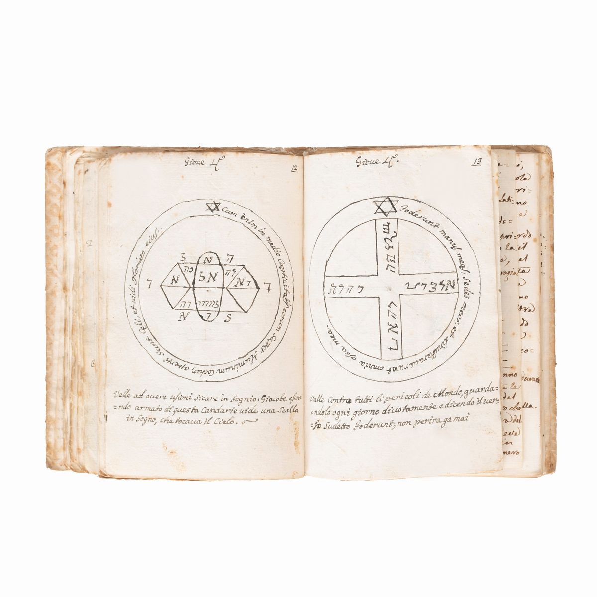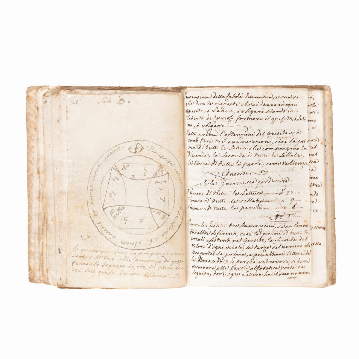 The codex opens with a centered "Warning to the Reader" on Kabbalistic terminology: "In the invocations that are made to God described in this Gem of precious secrets, we find names that to someone might seem fabulous, instead of Holy Names...". The treatise follows, Giemma Secretorum aut vera et Realis Salomonis Clavicola. From the Chaldean Translated into the Hebrew language of Lattino voscia from what was translated into our Italian in the year 1515. At the bottom, “23 chapters. 17 of the first book, and sixteen of the second with 28 pentagons [pentacles].” 28 annotated pentacles follow. The other sections in succession are: "invention of the Numerical Cabala", with various illustrative tables; the "Magic Wheel", with the relative Declaration and two other magic wheels; "Some magical superstitions" all very interesting because they are aimed at keeping lovers, driving out devils while one sleeps, etc.; an "Oration" aimed at driving away fever and other ailments; the “Magic Cross” (= Monas Hieroglyphica); a chapter entitled "Astrology"; the “Pentagonal Figure”.