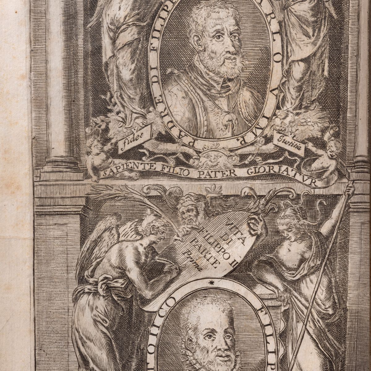 Coligni (but Geneva), for Giovanni Antonio Chouet, 1679. In 4°, voll. 2, frontispiece engraved on copper with the portraits of Charles V and Philip II, in a medallion, enclosed in an allegorical frame, pp. (66)-598-(48); (40)-640-(40, last white). Coeval full leather binding, gilt-decorated spine with six compartments, colored edges.