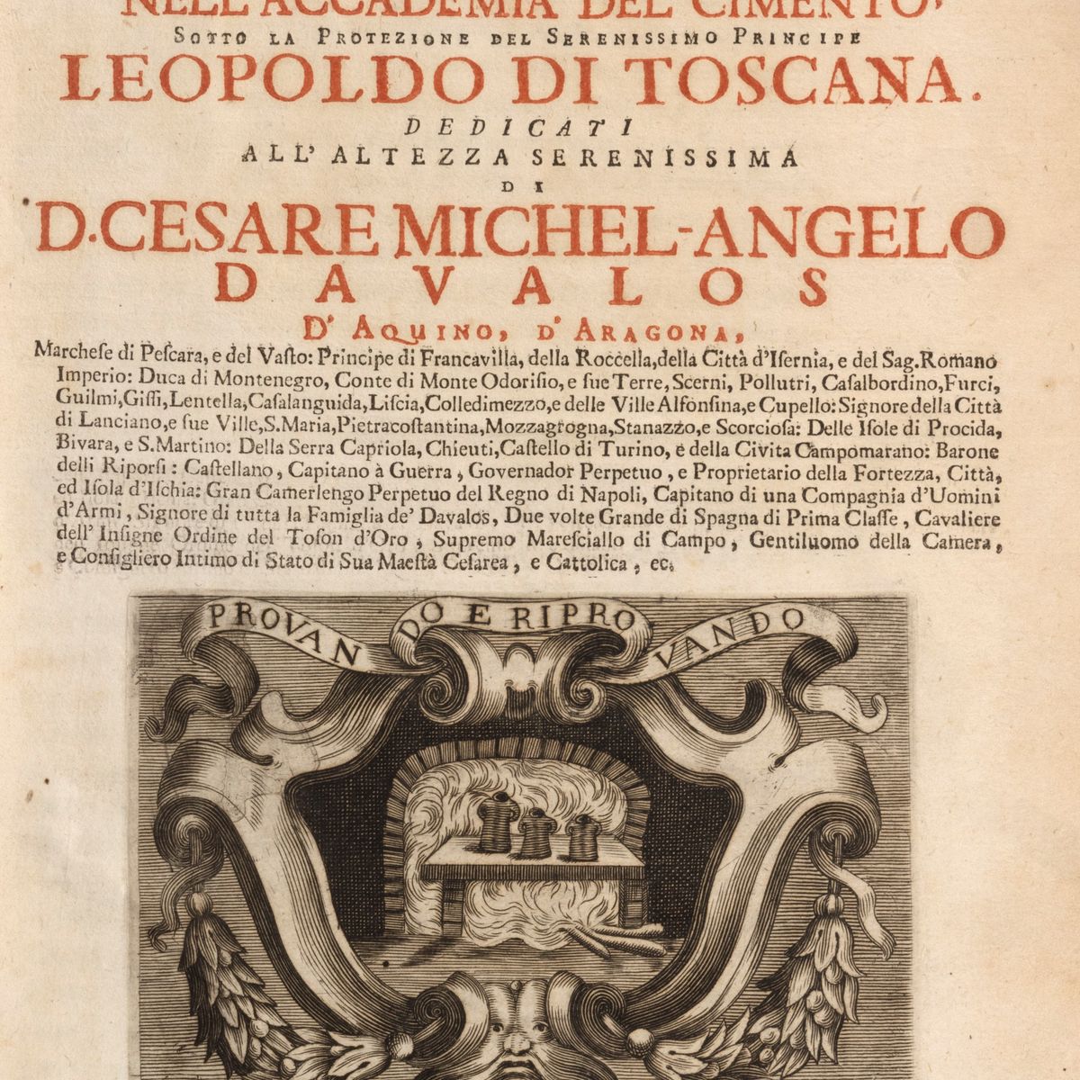 which was the main driving force behind the decision to embrace the Habsburg cause. The palace of Vasto with the heraldic crests and standards, the rich and magnificent furnishings that off the spectacle of the superb picture gallery offers those who ask for an audience, evidence of a propensity for cultural investment; with the theater which sanctioned a noble sociality even in that provincial town; the impressive library that Cesare Michelangelo kept in the castle of Vasto is even more striking for its size and contents, with readings and texts that declare his attitude as a nobleman Renaissance inspired by the Machiavellian Prince. In this atmosphere, the publishing enterprise of 1714 was born and developed, which celebrates Magalotti's scientific genius in the present work.