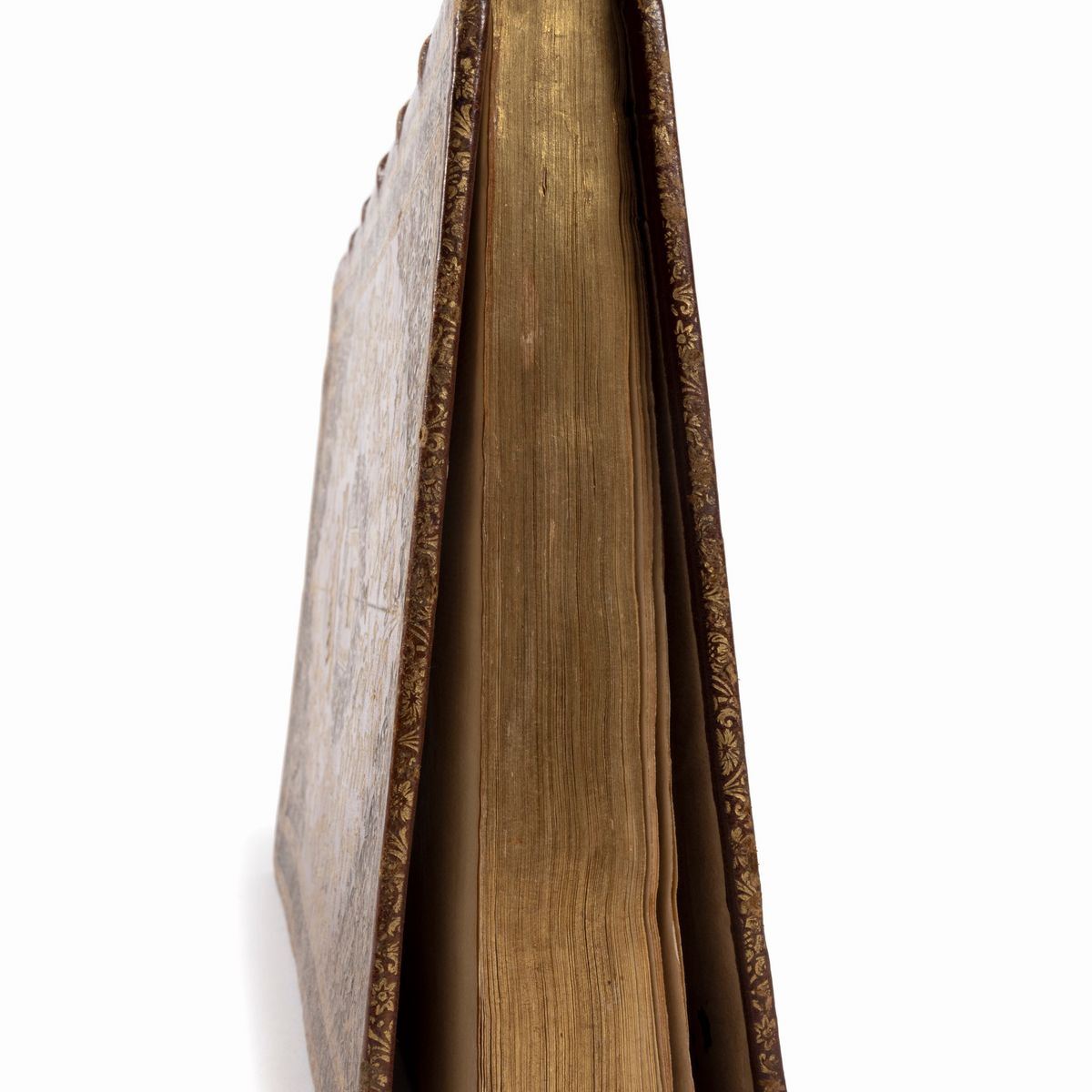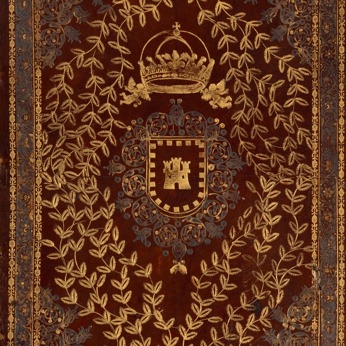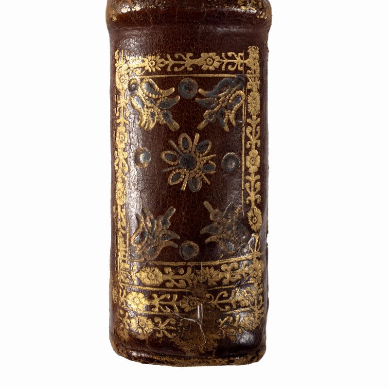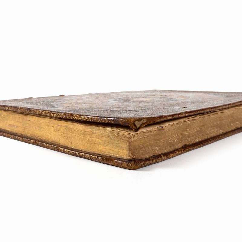 Naples, Bernardo Michele Raillard, 1714. In 2°. Title page imprinted in red and black with large typographical brand and 75 beautiful chalcographic engravings in the text, all full page, occasional stains on the pages and marginal foxing, overall excellent copy, SPECTACULAR COEVAL BINDING AT THE ARMS OF THE DEDICATARY OF THE WORK, i.e. Cesare Michelangelo d'Avalos (1667-1729), splendid Neapolitan binding in hazelnut morocco with refined gold decorations on the plates, where the coat of arms stands out surmounted by the princely crown, spine with six compartments, gilt edges, slight defects and faults on the spine.