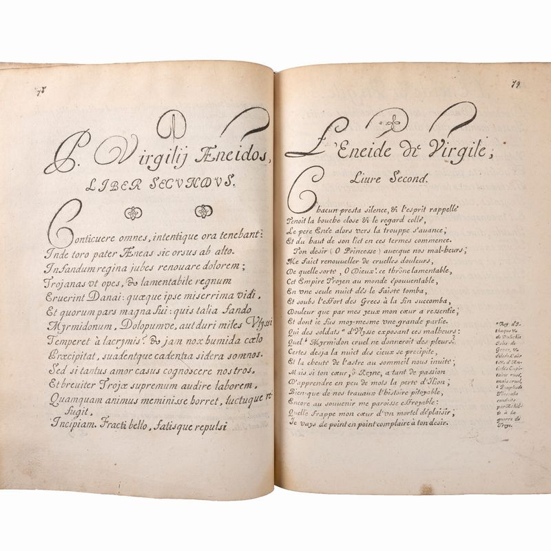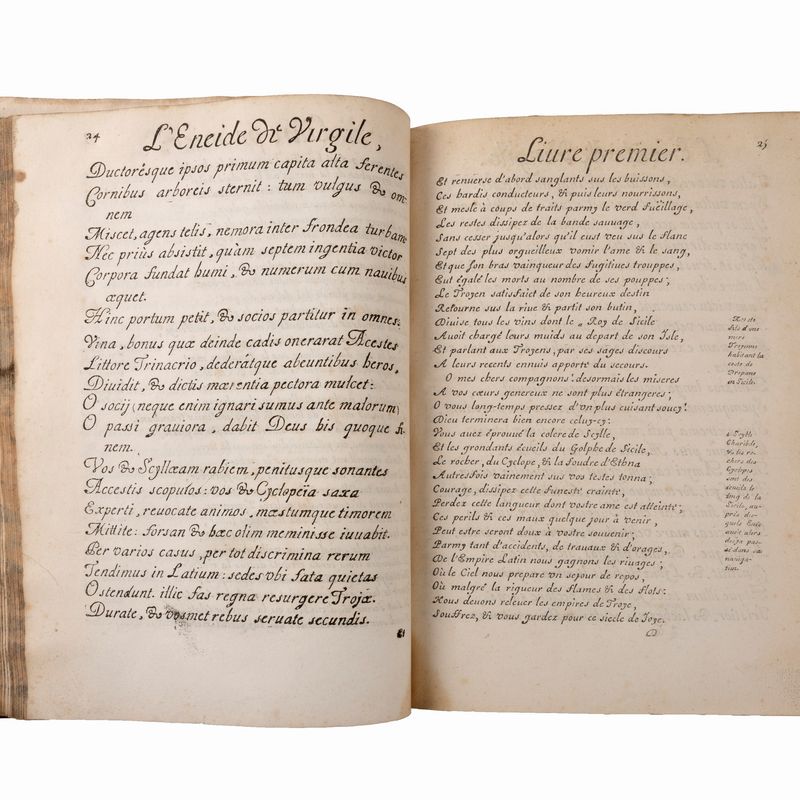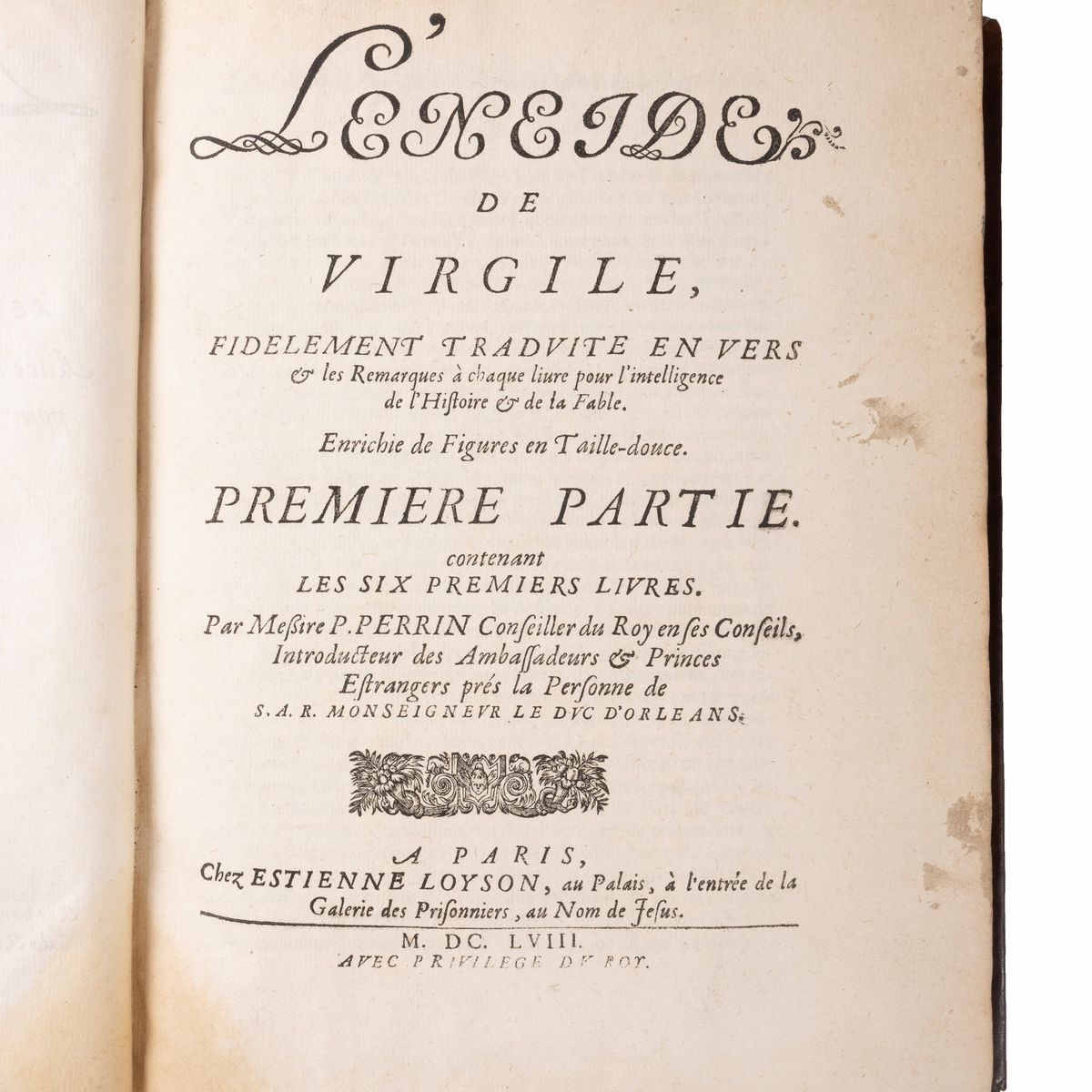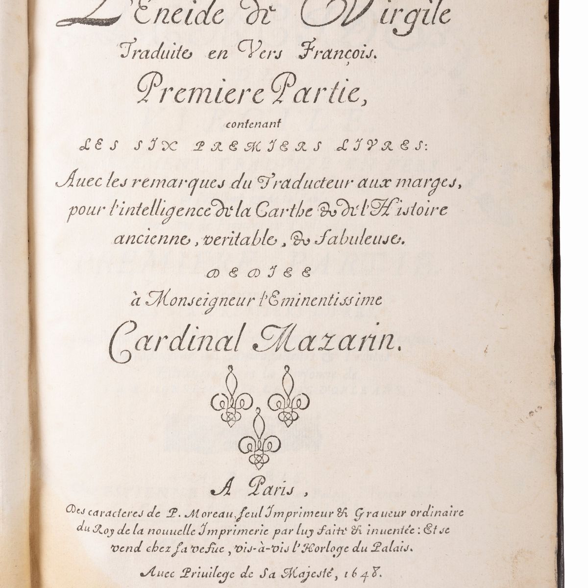 Paris, P. Moreau and Estienne Loyson, 1648-58. In 4th. 2 vols. Engraved frontispiece with historiated medallions, frontispiece with the coat of arms of Cardinal Mazarin, with 11 half-page intaglio vignettes (the eighth book of the second volume has no vignette), a double-page spread of Aeneas' journey, light browning, more intense on few leaves, some light foxing and small stains, some slight halos, slightly loose geographical map, contemporary binding in calfskin with gold noble coats of arms, gold titles on the spine with friezes with 5 raised bands, restorations, slight defects.