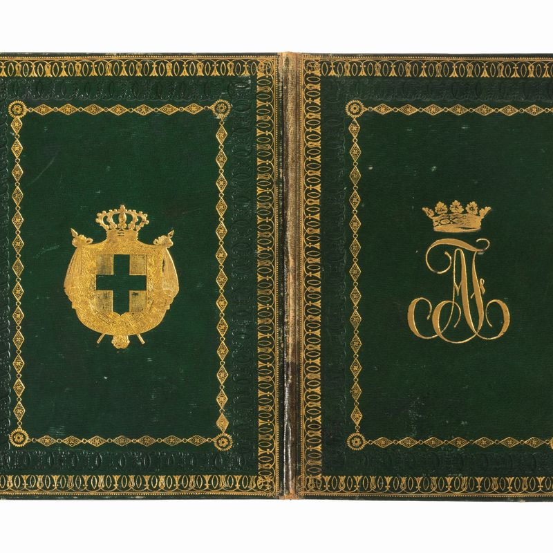 Turin, Giuseppe Fodratti, 1840. In large 8th. Chalcographic coat of arms on the title page, with full-page and folded tables, octavo binding, in brown morocco  long-grain, decoration embossed in gold and embossed, in the center of the field  of the front plate the initials  "C.A", golden edges, slight defects. On the backplate ex libris  "Library of HRH / THE Duke of Genoa". § In the lot another empty binding in green morocco, wheels  with stylized motifs to frame the plates, ducal initials on the front plate and on the back a large Savoy cross surmounted by a crown, gold-embossed decoration, minor defects. Bookplate  "Library of HRH / THE Duke of Genoa".
