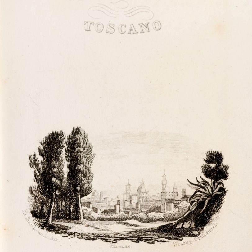 S.l., s.n., 1846. In 8th. with the two portraits engraved in copper on plates f.t. of the Grand Duke and his wife, many engravings in the text, scattered light reddenings, red morocco binding, gold-embossed decoration, frames framing the plates, in the center of the field large coat of arms of the Grand Duchy of Tuscany, surmounted by a crown, on the smooth spine title, date and friezes, gilt edges.