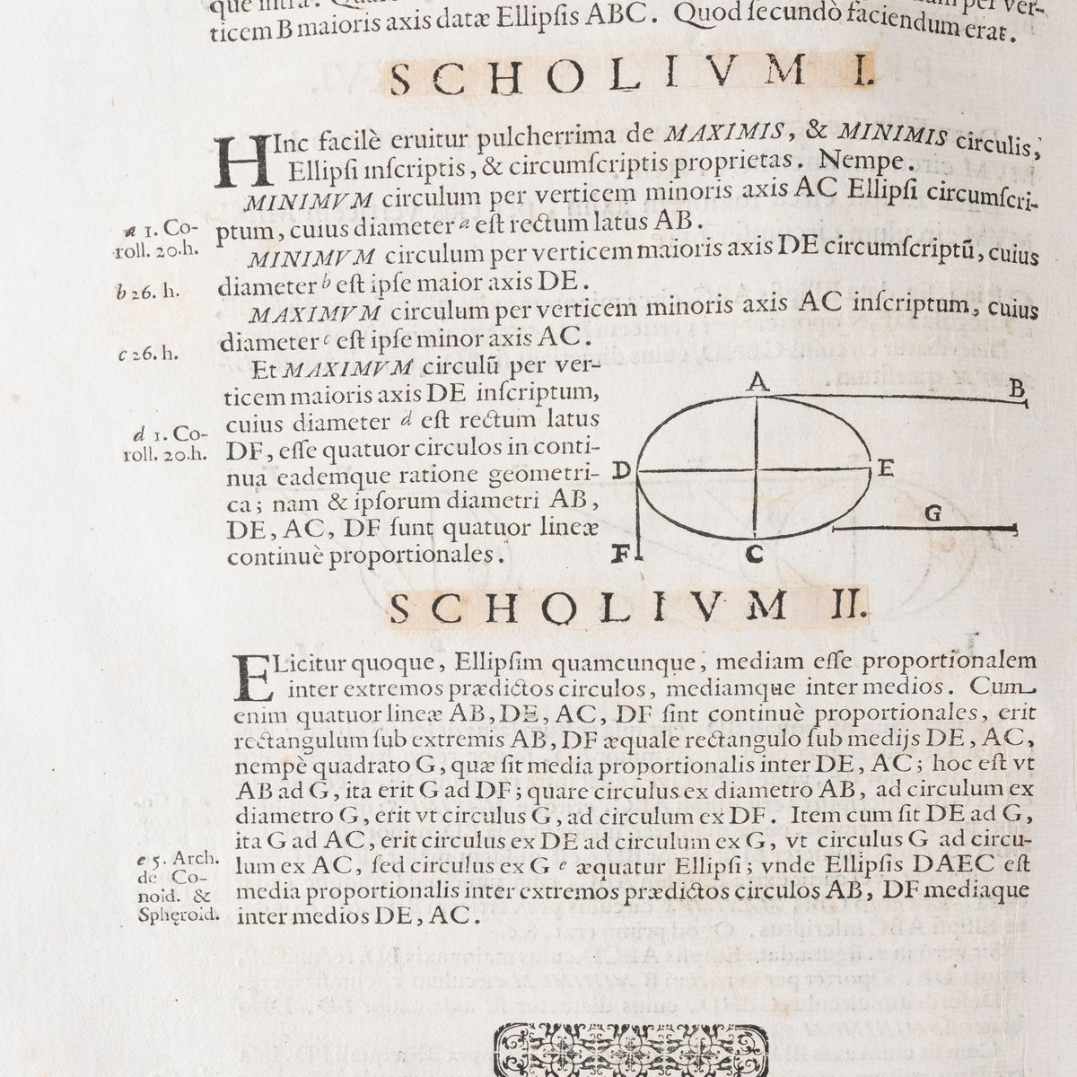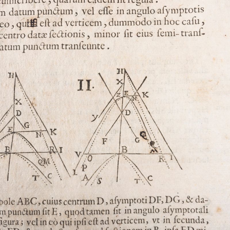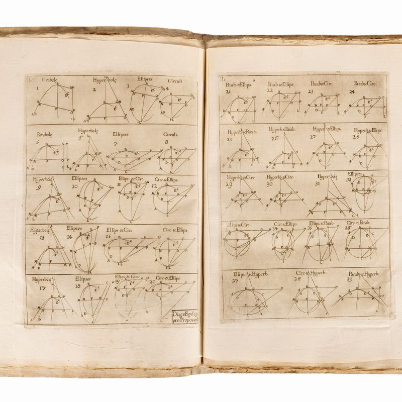 Florence Giuseppe Cecchini, 1659. In folio, two books each with its own title page in red and black and woodcut Medici coat of arms, half-title (Demaximis, et minimis libri duo), numerous woodcuts in the text. (8cc), 154pp, 2 intaglio plates; (2cc), 154pp, 2 intaglio plates, (1cc dierrata). Copy in beards, coeval hardcover binding, handwritten title on the spine, sprayed edges, hundreds of small pen corrections by Viviani himself, as he describes in the lines above the Errata, also corrections on printed strips.