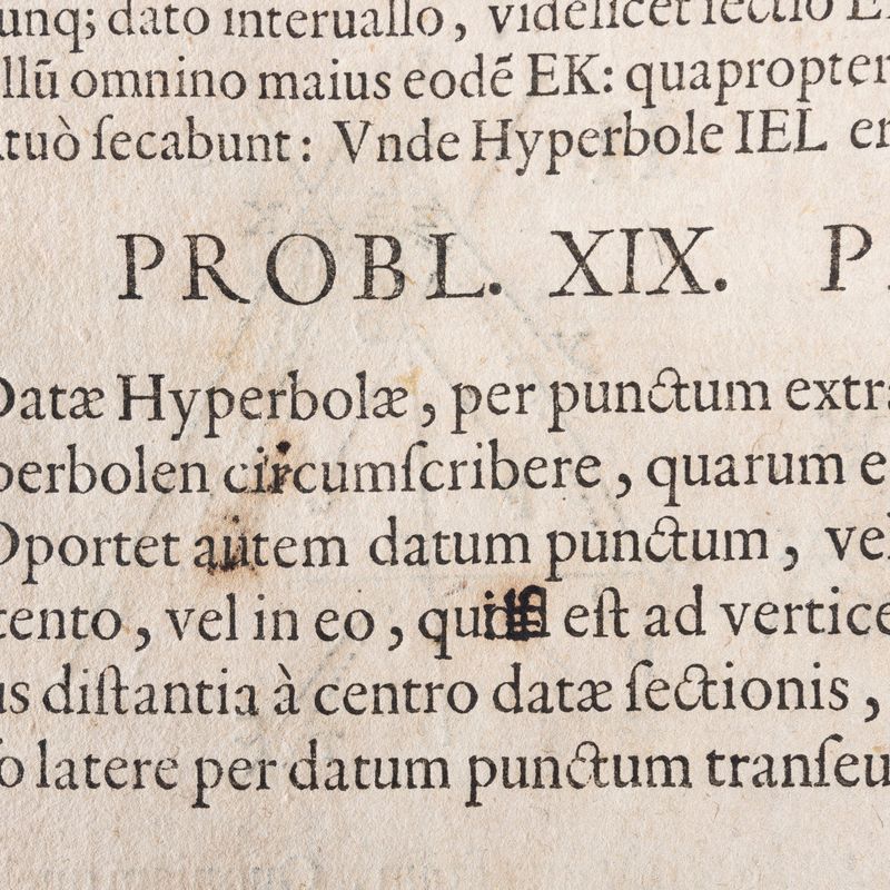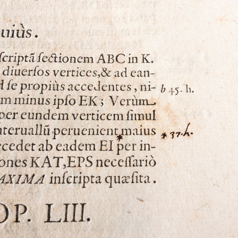 The corrective practice of intervening with punctual pen corrections on the specimens, or on the individual print sheets (stop press correction or even pen correction), is attested since the fifteenth century. See the example of De Aetna by Pietro Bembo, 1495. Many editions, especially scientific ones, will undergo this practice, due to the need to intervene with precision on the reliability of the text. The most sensational case is that of Galilei with his Sidereus, where the author's interventions are not numerous but punctual. The same happens for this edition of Viviani, where a series of precise and punctual corrections allow the author to amend the text on key points.
