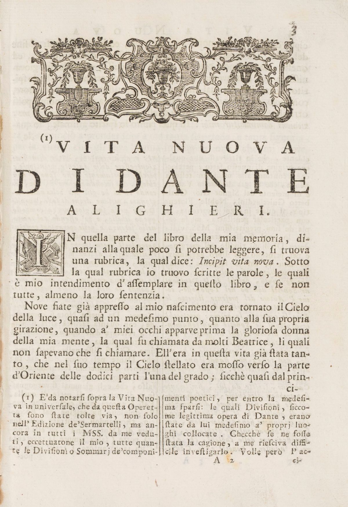 Venice, Antonio Zatta, 1760. In 8th.  7 parts in 5 vols. Frontispiece with portrait of the author engraved in copper and frontispiece in red and black to the first volume, with 2 copper engravings, 1 folded family tree table, woodcut headers at the beginning of each canticle, rare and light foxings, some light browning, binding Coeval in leather, gold impressions on the plates, title within a gusset on the spine, some shortcomings, defects.