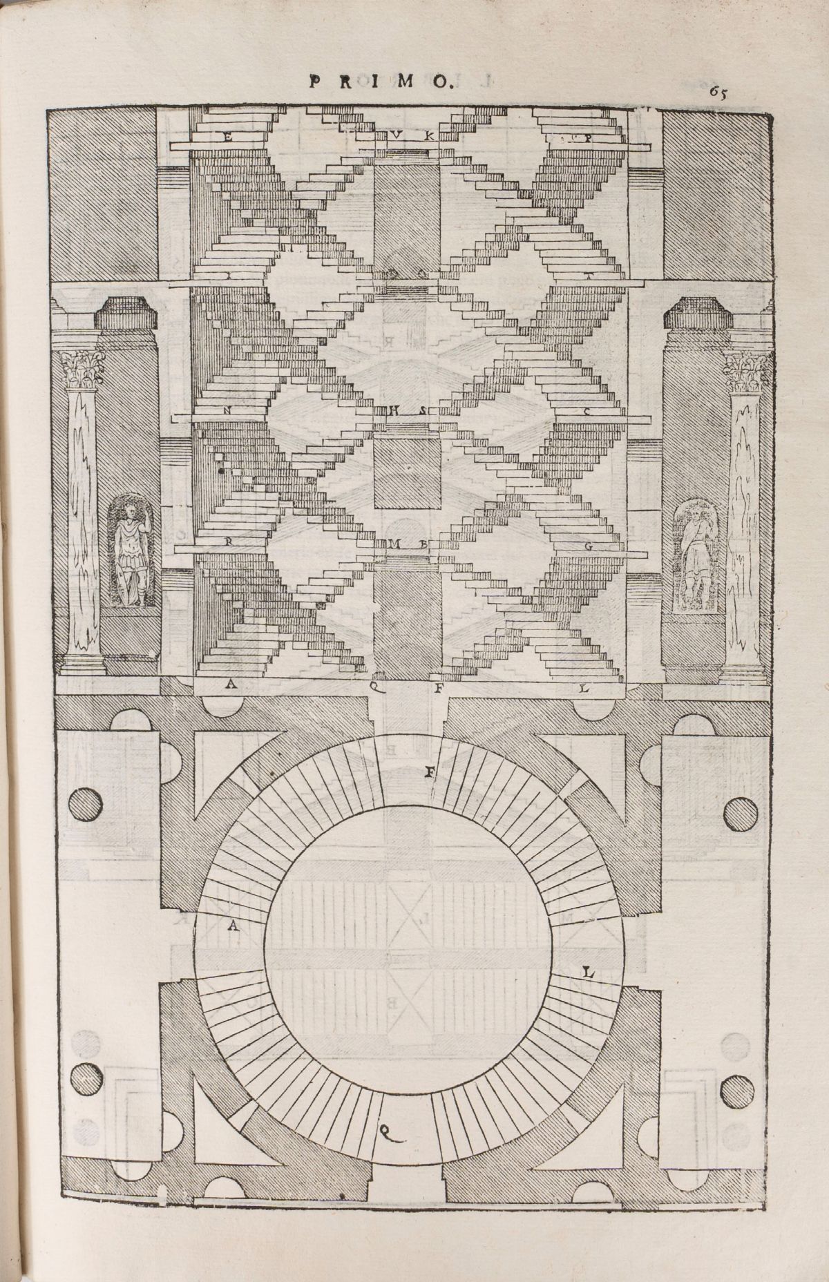 Venice, Bartolomeo Carampello, 1601. In 2nd. 4 parts in one volume each with its own engraved architectural frontispiece, with 221 woodcut engravings, some of which are full or double page by Giovanni and Cristoforo Chrieger, Cristoforo Coriolano based on a design by Andrea Palladio, restorations on the first and last pages, gora d 'water, more extensive in the last installments, woodworm work on the external margin, binding from a later period in parchment, manuscript title on the spine.