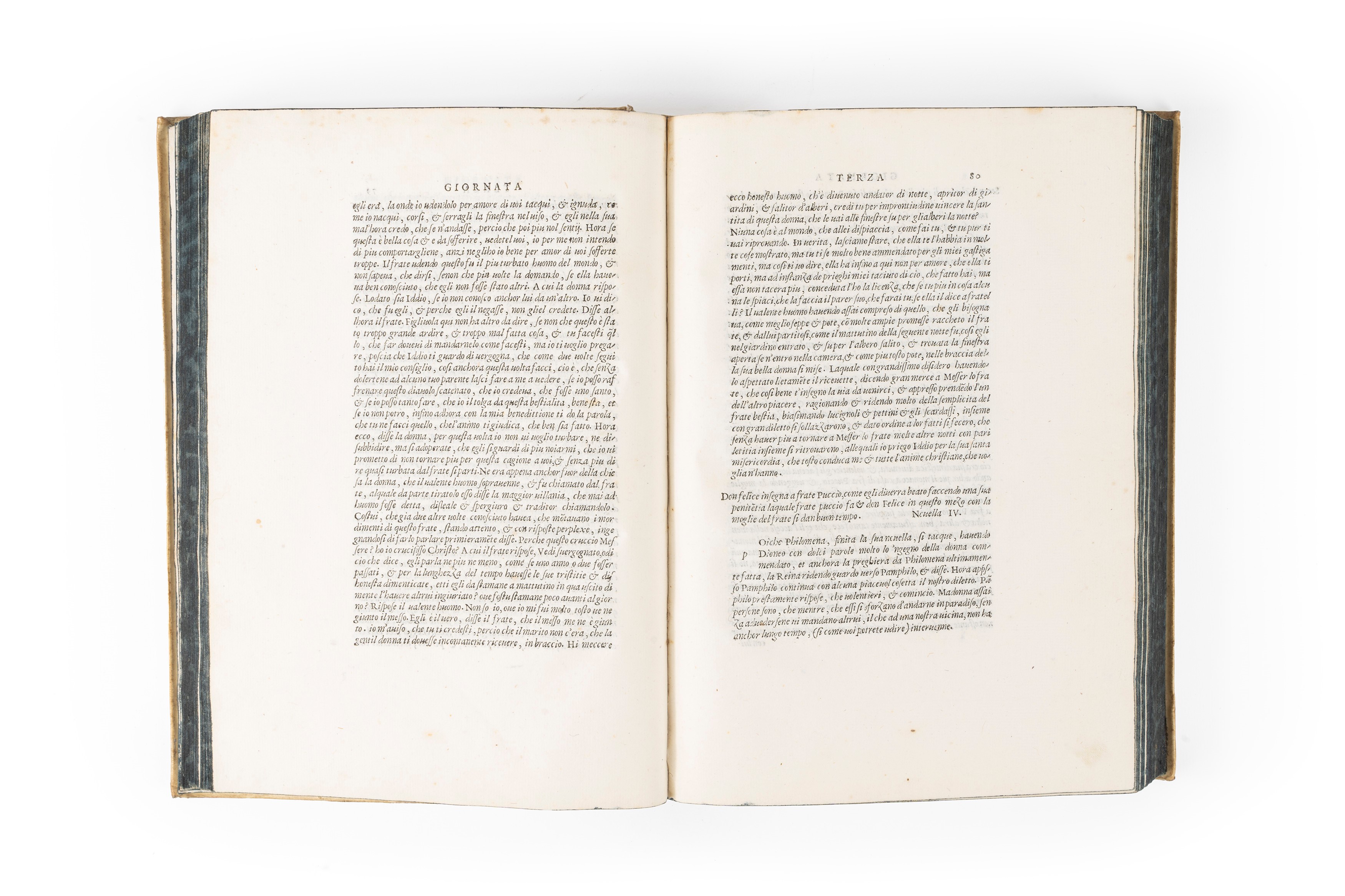 Eighteenth-century counterfeit of the famous Giunti edition called the Ventisettana, printed in 300 copies at the request of the English consul Smith, due to the rarity, already at the time, of the Giunti original. "Stefano Orlandelli executed with the Pasinello presses in Venice in the year 1729, at the expense of Salvatore Ferrari, a reprint in number (it is said) of 300 copies, with one on parchment. Of this reprint which is often incorrectly indicated as a counterfeit, the editor of the Decameron, 1761, offers a note of over 450 blunders..." Gamba 172, notes; Brunet I, 998-999.