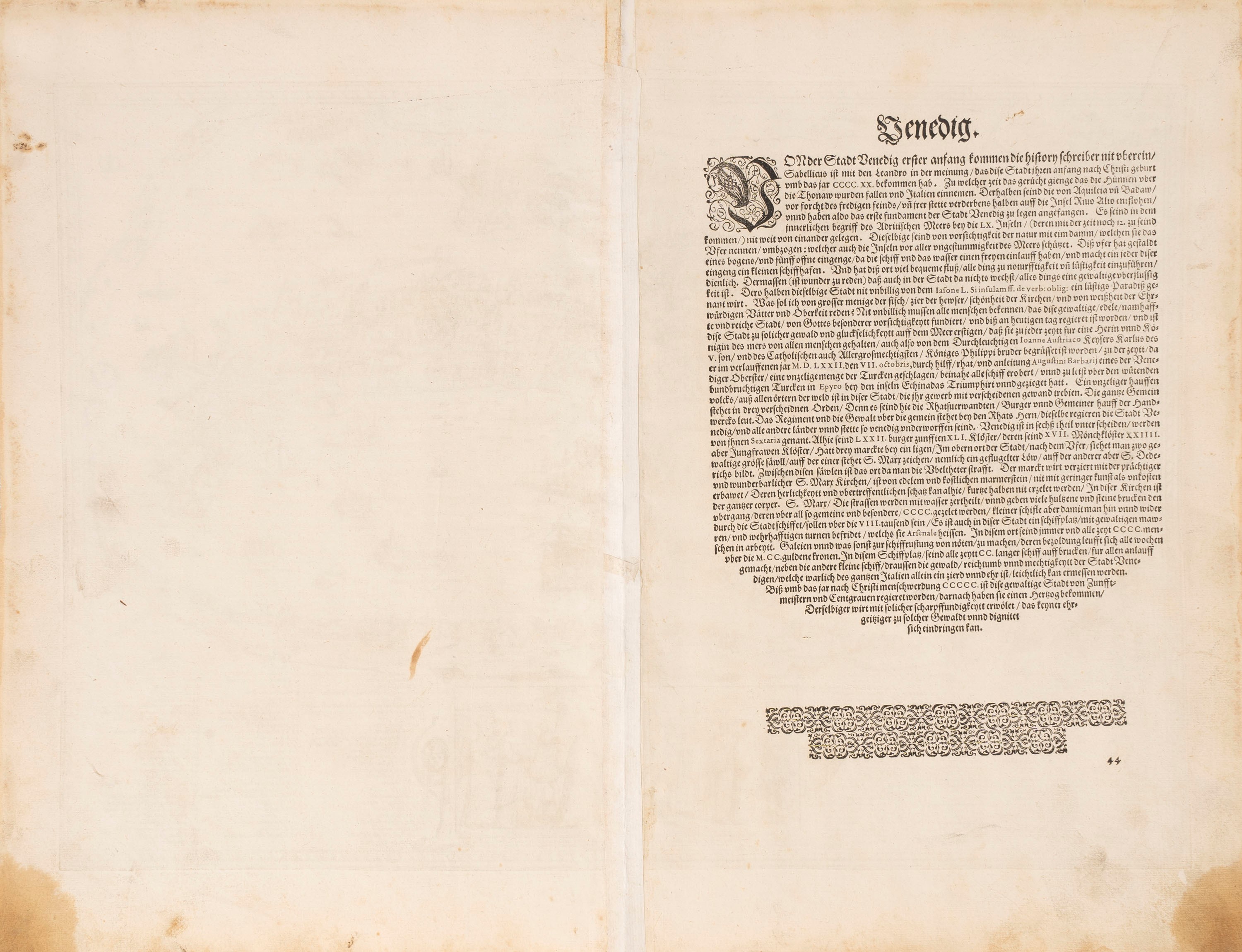 Cologne, 1574. Copper engraving, taken from "Civitate Orbis Terrarum..". The paper is adorned with artistic scrolls containing a representation of the Ducal Procession and a legend with 153 references in medieval Italian and Venetian dialect. It measures 48 x 34 cm plus wide margins. German text on the reverse. Panoramic bird's eye view of the Serenissima. The lower part is enriched by a large cartouche depicting the ducal procession on the day of Corpus Domini, inspired by the great work engraved by Matteo Pagano in 1559