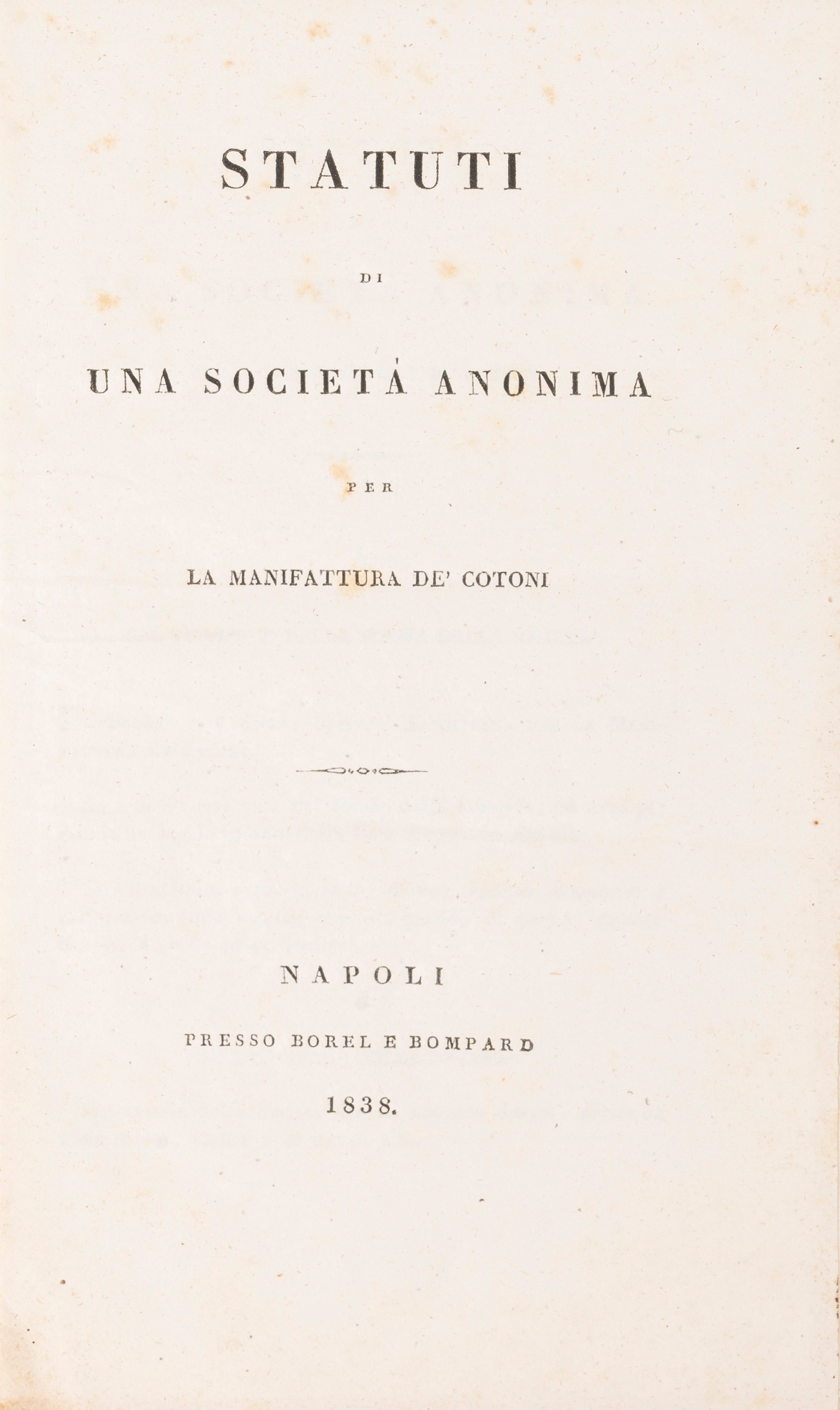 Naples, Chianese, 1821. In 16°, pp. 63-(3). Hardback. Original edition. Rare. § Together: Statutes of a joint-stock company for the manufacture of cotton. Naples, Borel and Bompard, 1838. 8, pp. 19 with a folded "Formula d'Azioni" facsimile f.t. Silent cover. Scattered blooms. § De Piro, Antonio. On the public and private advantages of roads, bridges, deforestations and rural houses for travellers, landowners, shopkeepers and artists. Naples, 1841. 16th, pp. 38-(2). Editorial paperback. Rare. Light browning, scattered blooms.