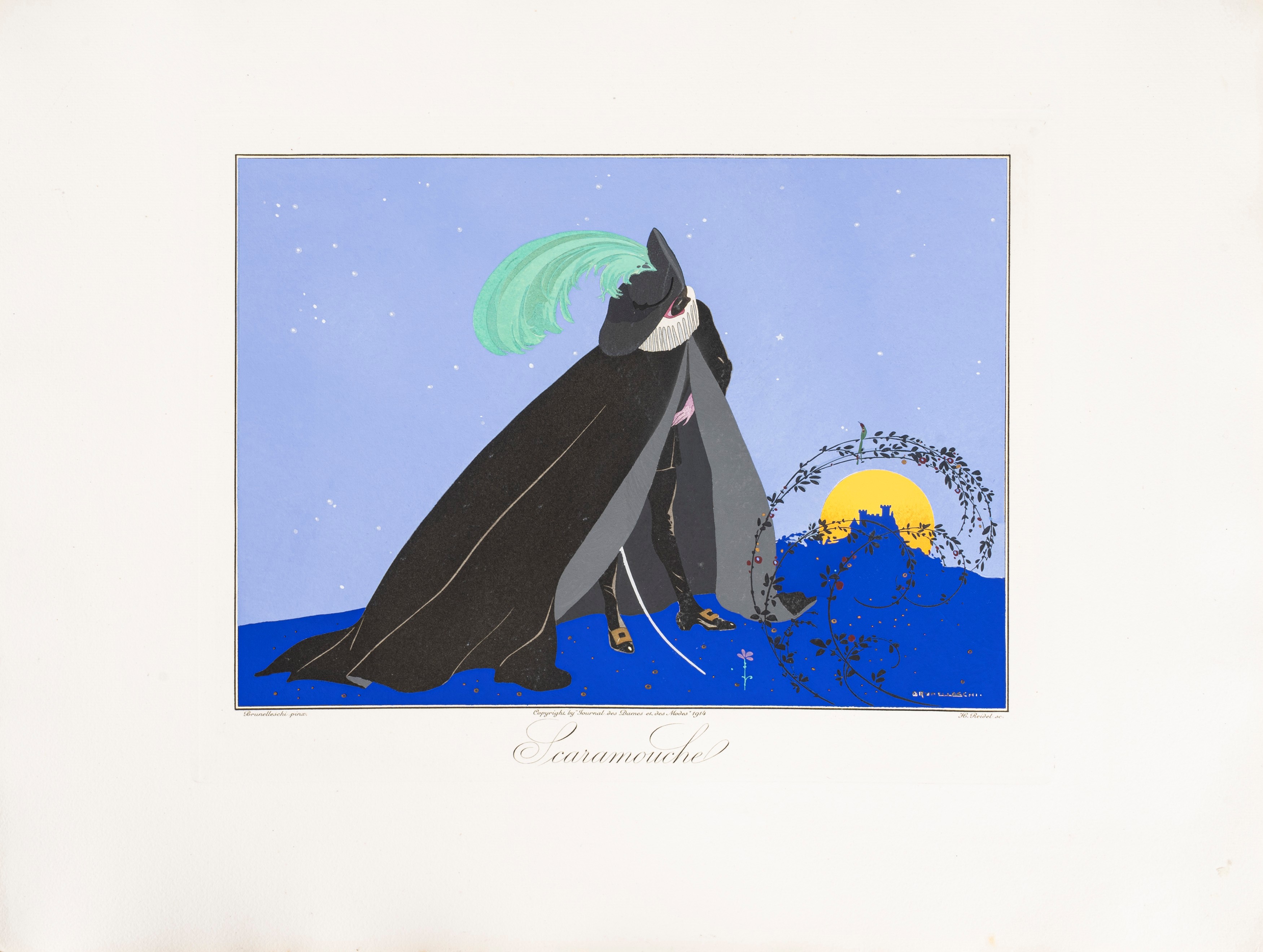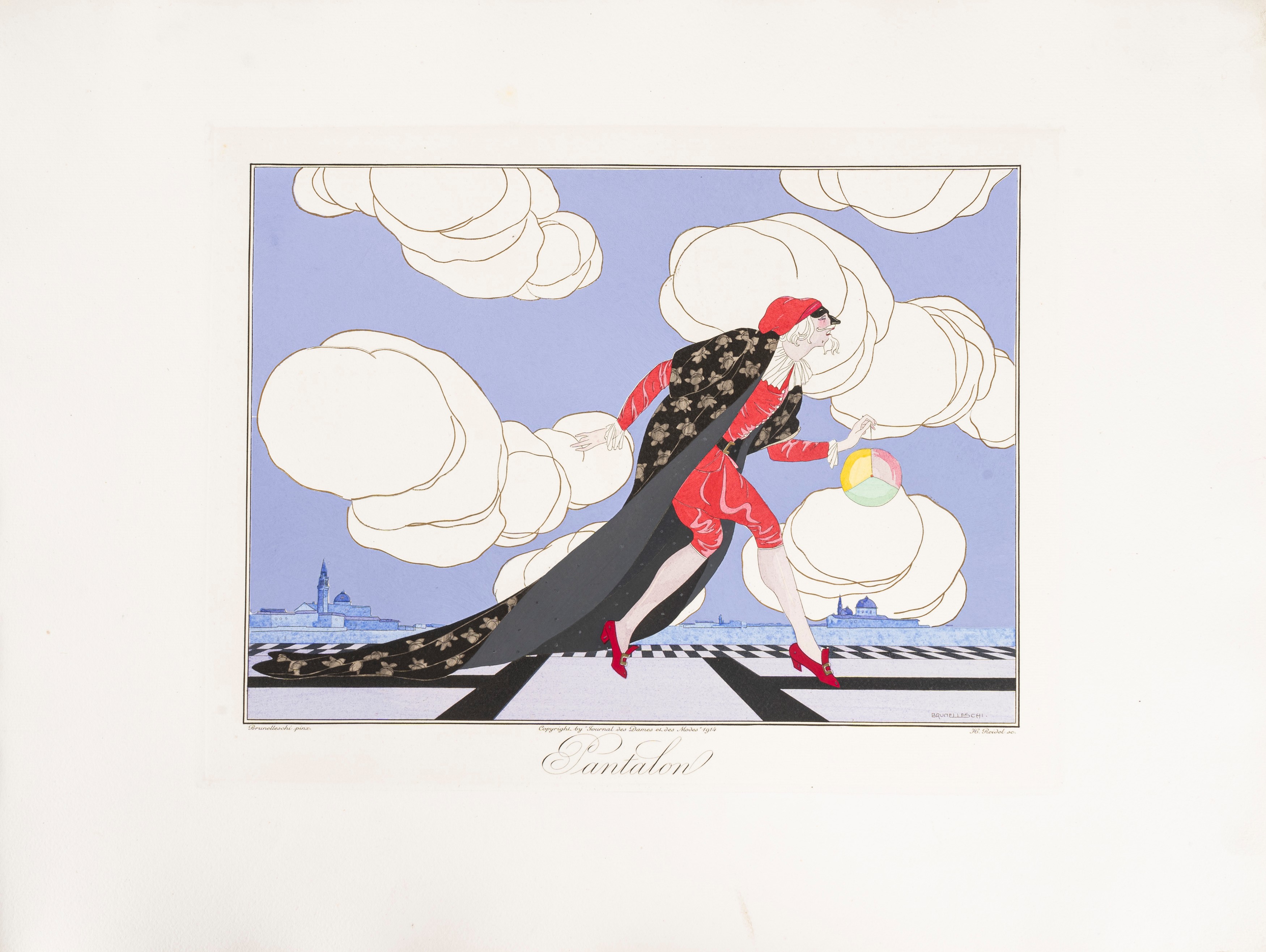 SPLENDID COMPLETE EXAMPLE OF THE FAMOUS SERIES OF 12 PLATES DEDICATED TO ITALIAN MASKS, engraved by Reidel on DRAWINGS OF BRUNELLEESCHI. They depict characters from the Commedia dell'Arte: Scaramouche, Tartaglia, Arlequin, Pantalone, Trivellino, Rosauro, Docteur Ballanzone, Brighella, Mezzetin et Colombine, Coralline, Florindo and Giacometta. The colorful costumed characters are represented in the foreground on imaginative sets with scenarios of luxurious Florentine palaces and gardens. It is an early work by the Italian painter and set designer Umberto Brunelleschi (1879 1949), also known for his illustrations in the Gazette du Bon Ton and in the Journal des Dames et des Modes i>.