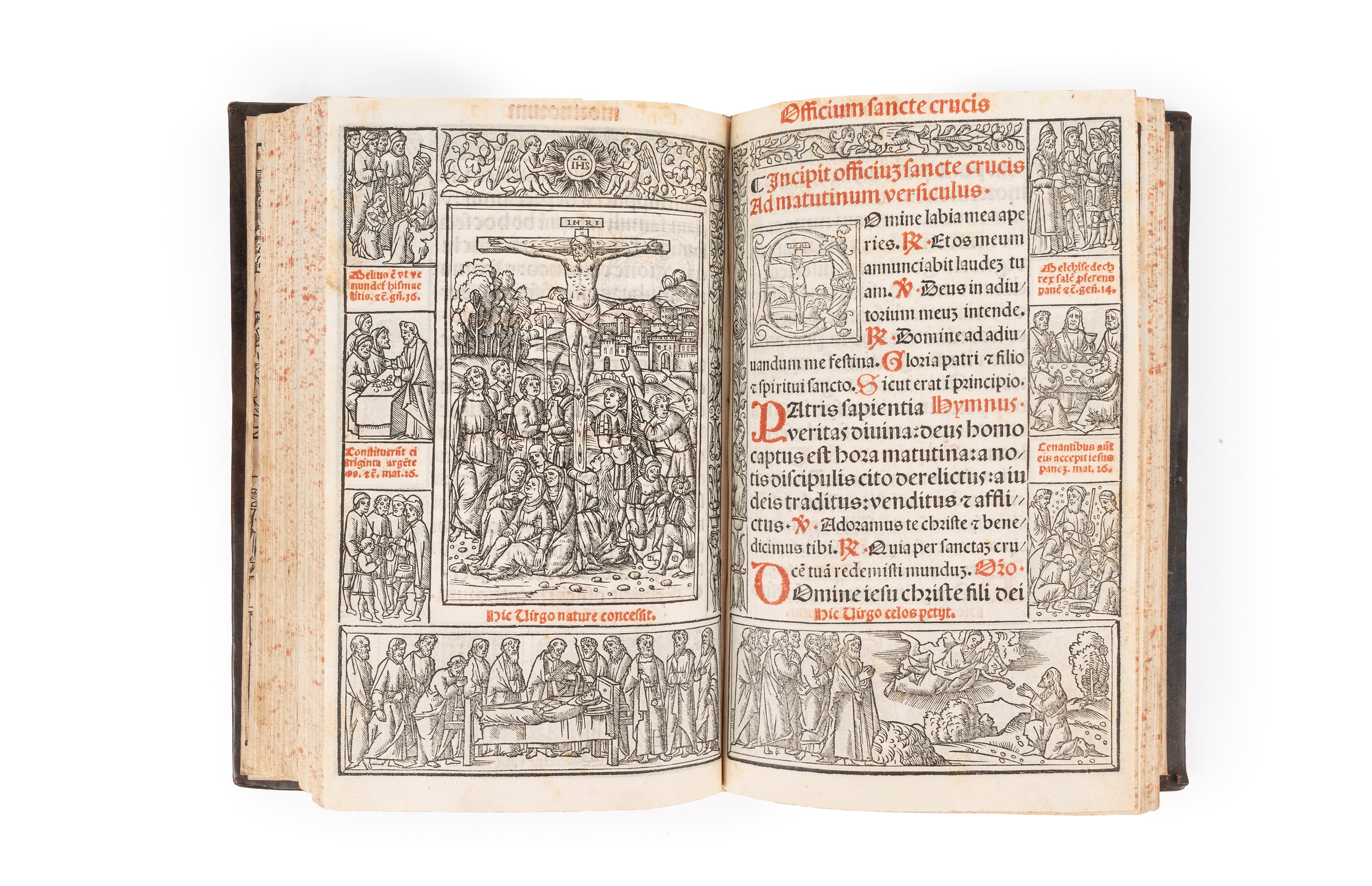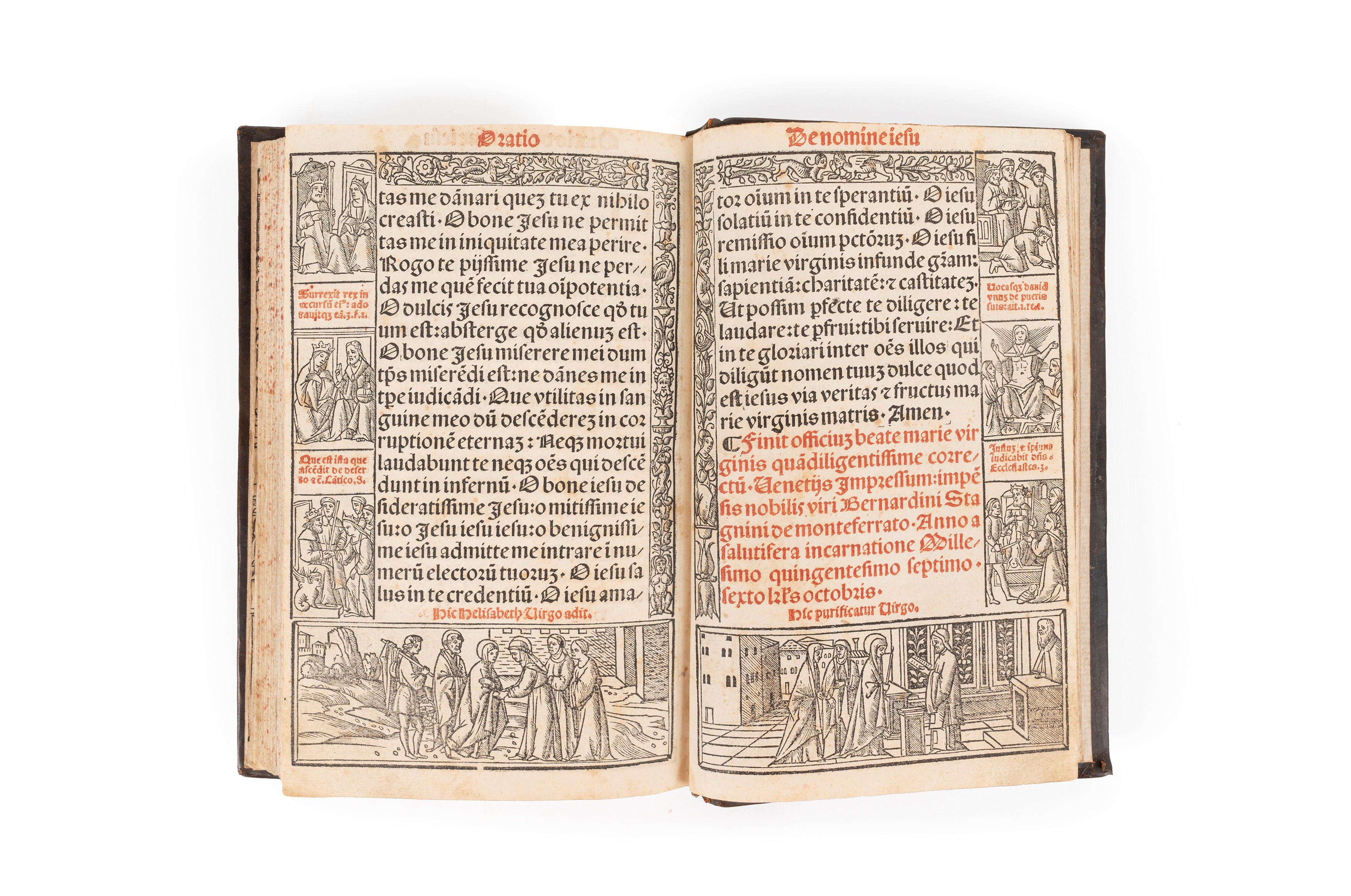 Venice,  Bernardino Stagnino the Elder, 1507. In the 8th. On the title page, printed in red and black, brand depicting a Crown with flowers and initials B.S., volume richly illustrated with text in red and black, at the center of each page the textual part surrounded by a frame decorated with cartoons, graphic levels and bodies of different characters, initials in red, paper *10 missing, some slight restoration but overall a splendid example, modern leather binding with dry impressions on the model of Renaissance bindings.
