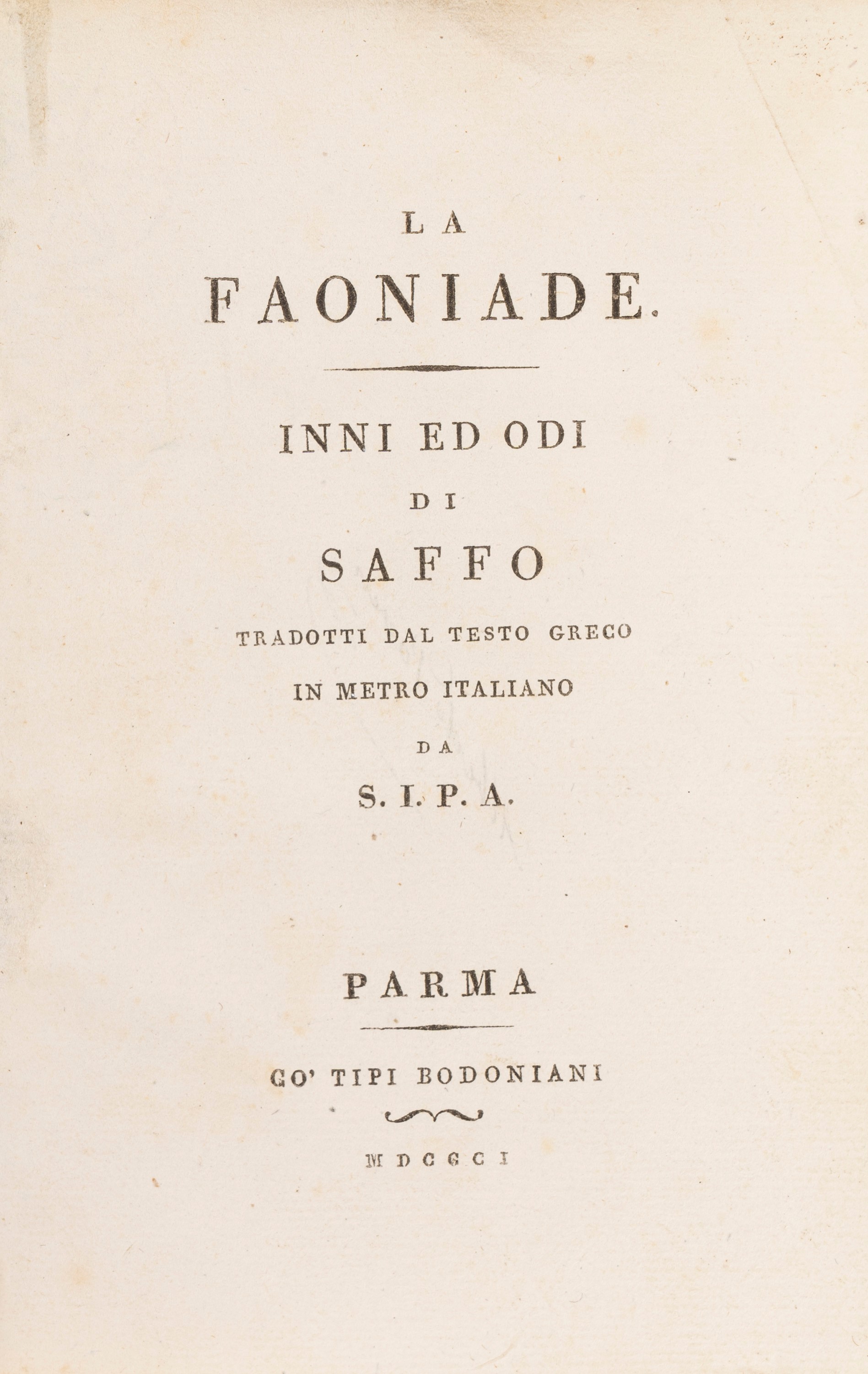 Parma, Bodoni, 1798. In 8th. Hardback binding, defects on the spine. § Sappho, The Phaoniad. Hymns and odes. Parma, Co' Tipi Bodoniani, 1801. In 8th. Membership signature on the flyleaf. Cardboard binding.