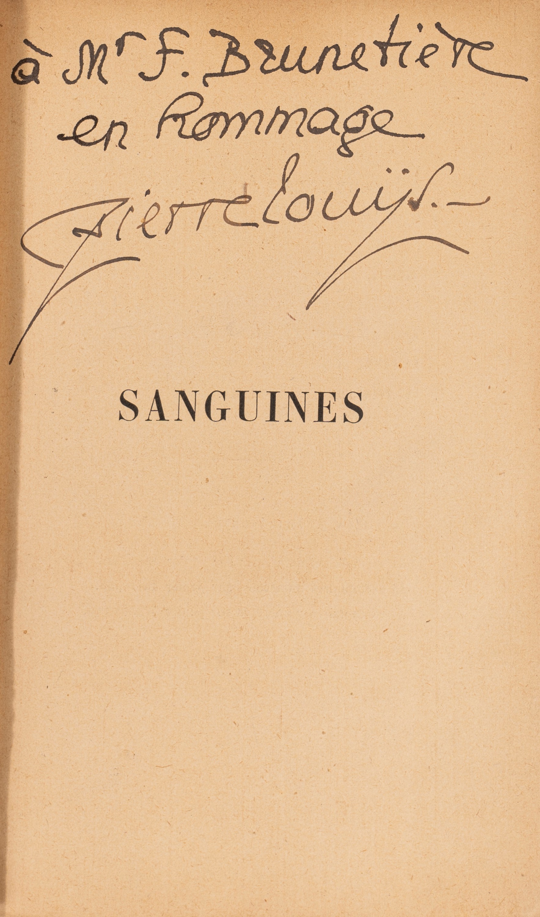 Paris, Bibliotheque-Charpentier, 1903. In 12°, 186 x 122 mm. Yellow editorial paperback binding, with small losses at the edges, spine reinforced with scotch tape. Presentation copy, the flyleaf reads: "à M. F. Brunetiere en hommage Pierre Louys."