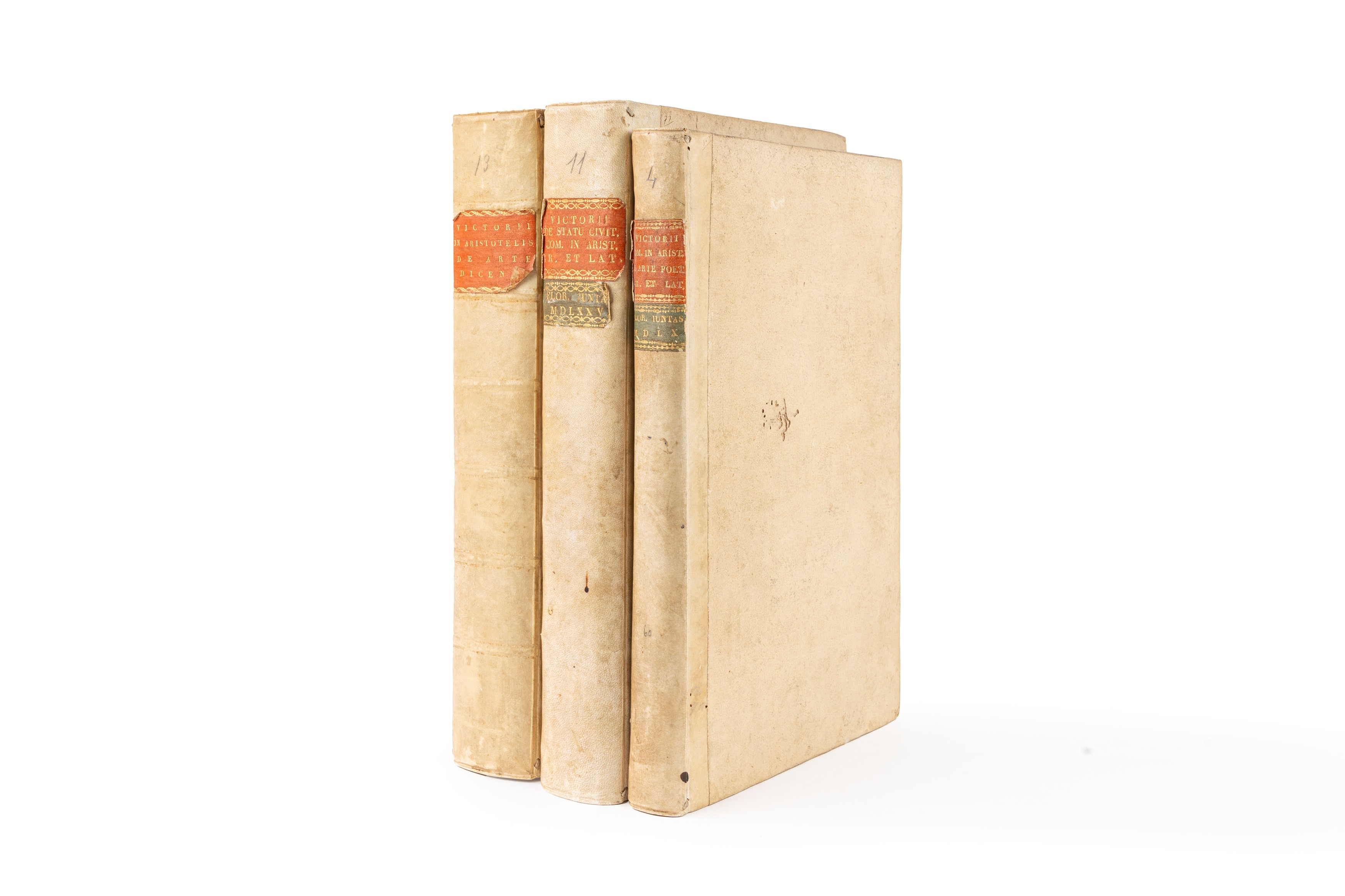 Florence, heirs of the Council, 1576. In 2nd. Printer's mark on the title page and at the end, woodcut initials, some slight defects, contemporary binding in rigid parchment, gusset with gold title on the spine, slight defects. Paper slip belonging to the counterplate. § Together in the lot by the same author and with the same binding:Commentarii in tres libros Aristotelis de arte dicendi, Florence, Giunta, 1589. In 2°. Printer's mark on the title page and at the end, woodcut initials, some geometric figures in the text, slight foxing, some reddening, contemporary binding in rigid parchment, tag with gold title on the spine, some worm holes, slight defects. Membership signature erased on the title page. § Commentarii in primum librum aristotelis de arte poetrum, Florence, heirs Bernardo Giunta, 1560. In 2°. Printer's mark on the title page and at the end, woodcut initials, some slight foxing, contemporary binding in rigid parchment, gusset with gold title on the spine, slight defects.