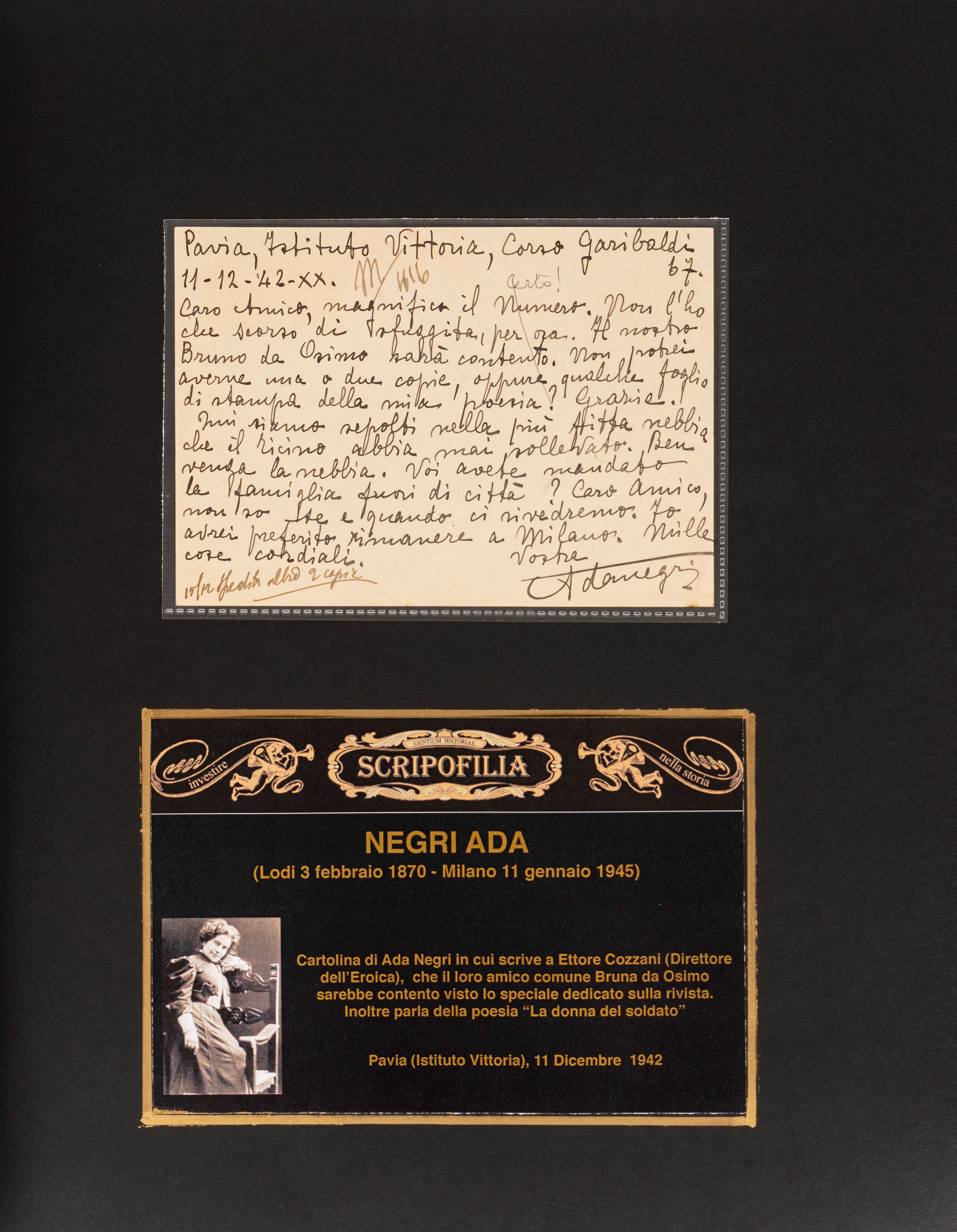 This is the incipit of the long memory of Ada Negri signed by Ettore Cozzani, dated Milan 13 January 1945, 3-4 pm. His close friend, the Poetess of Italy had died just two days before and with temporal precision (3-4 pm), Cozzani wants to capture on paper the image of his Ada Negri. He does so in 9 long pages perhaps unpublished, admirably sketching the character of the person and the art of one of the protagonists of the twentieth century. The missed Nobel given a couple of decades earlier to Deledda, but which she would have fully deserved.