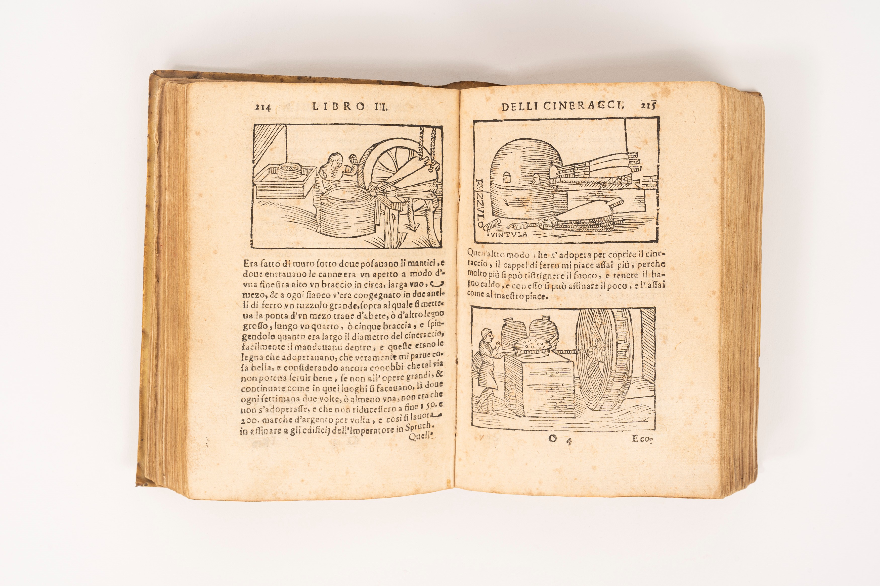 Bologna, Gioseffo Longhi, 1678. In 8°. Framed title page with Montecuccoli coat of arms, woodcut initials and endpapers, numerous woodcut illustrations in the text depicting tools, furnaces, molds, phases of metalworking and casting objects, gallery of woodworms on the last three leaves, scattered light foxing, light browning. Contemporary full parchment binding, manuscript title on the spine, some stains. A printing error is reported in the V8 collation.