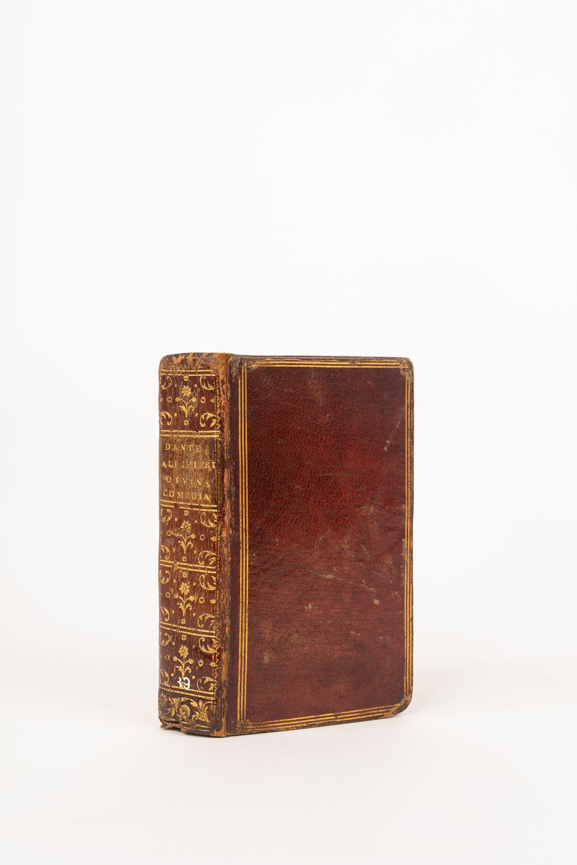 Lyon, by Guglielmo Rouillio, 1571. In 16°. Brand on the title page, full-page vignette at the beginning of the three Canticles, usual burnishing, copy in splendid red calf binding with gilded frames on the covers and gold decorations on the spine, sprayed cuts. Giuseppe Martini copy , n.1423.