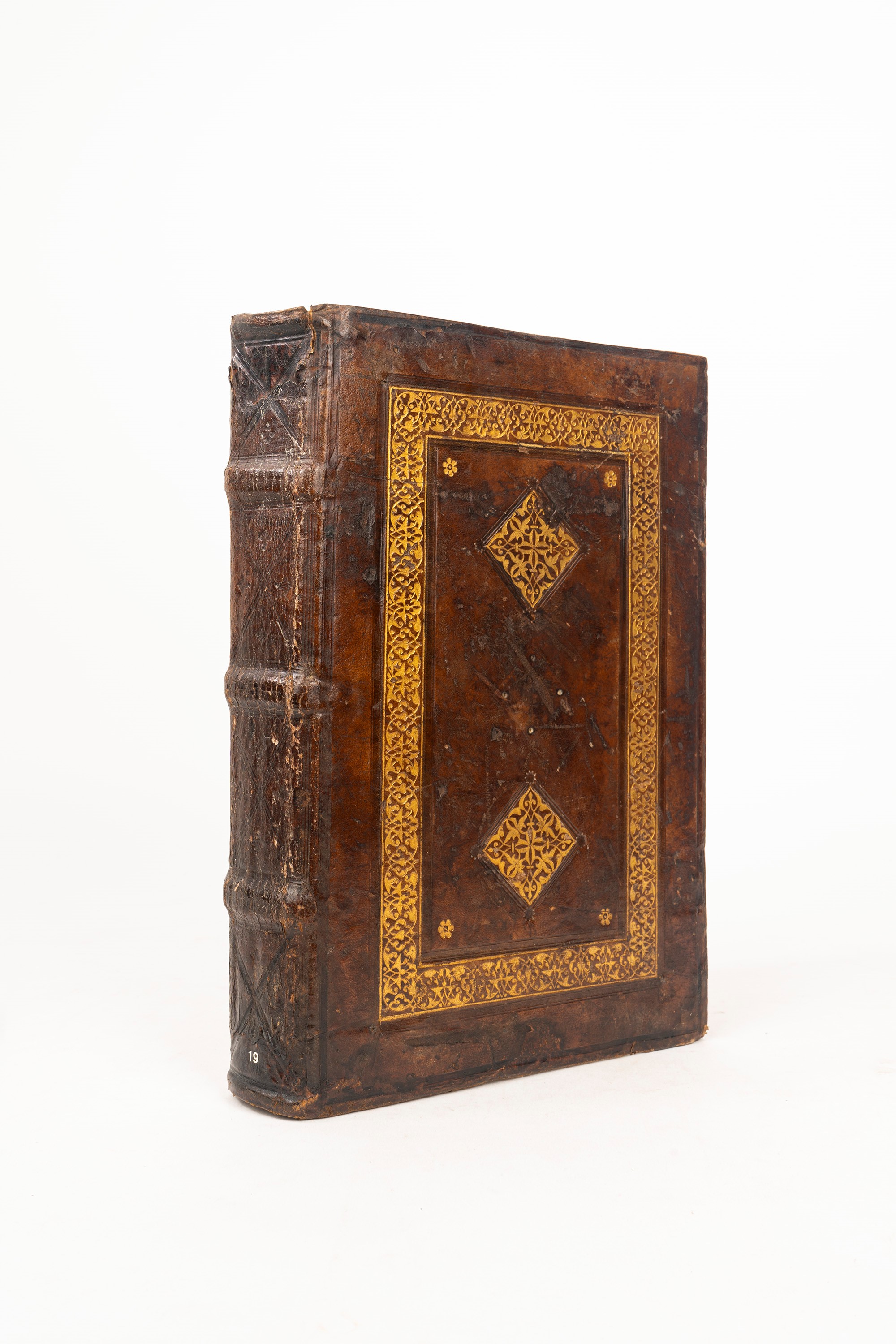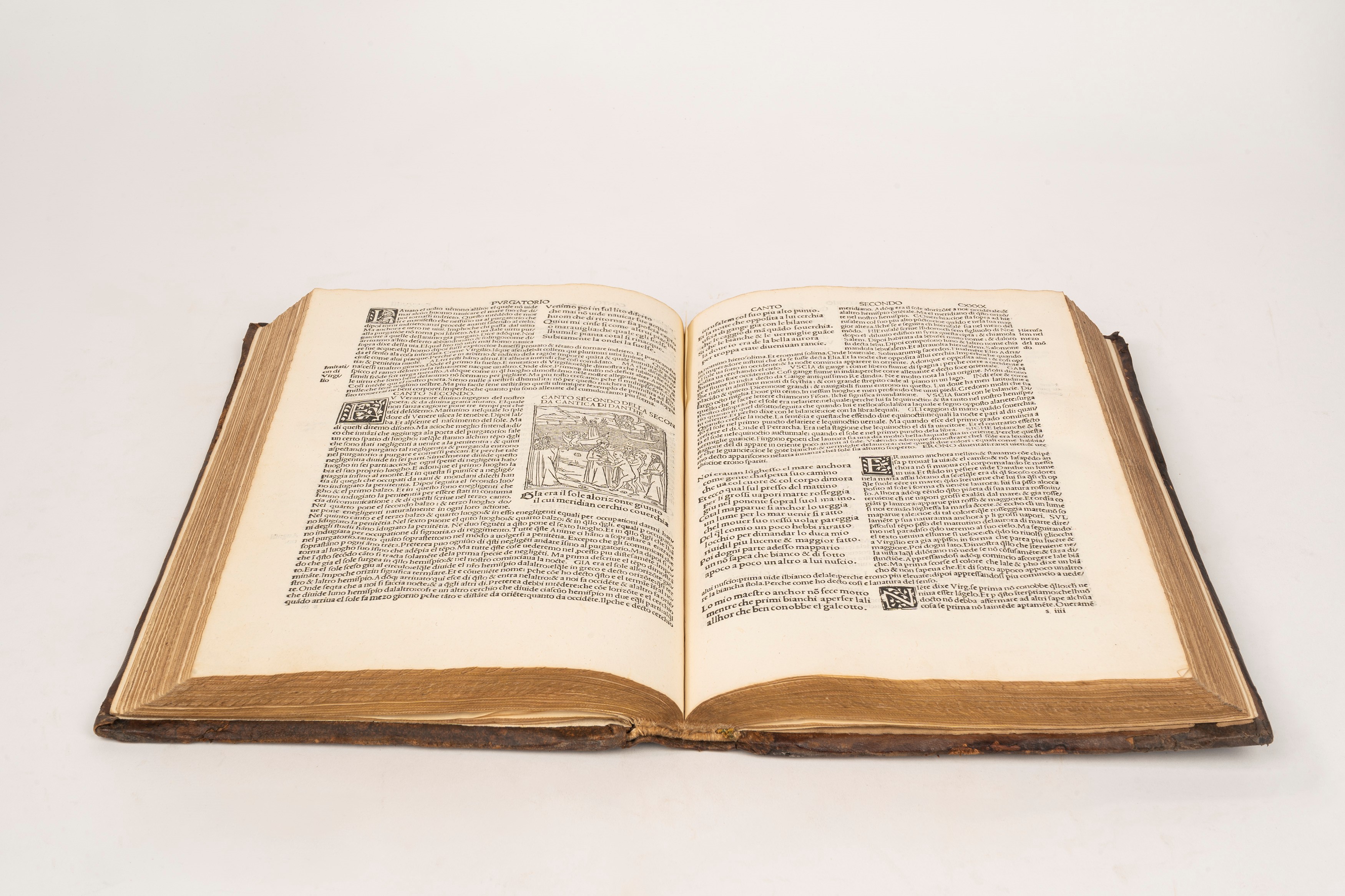 Venice, for Bartholomeo de Zanni da Portese, 1507 adi XVII de zugno. In 2°. Superbly illustrated with a splendid full-page woodcut within a historiated border at the opening of the Inferno and 99 smaller woodcuts in the text, attributed to the Master of Pico Plinio, numerous black and white woodcut initials of various sizes, marginal halos, but overall a stunning fresh copy, ORIGINAL VENETIAN BINDING WITH DRY IMPRESSIONS AND GOLD DECORATIONS ON THE PLATES , gilded and embossed edges, delicate restorations to the upper cap and headband.