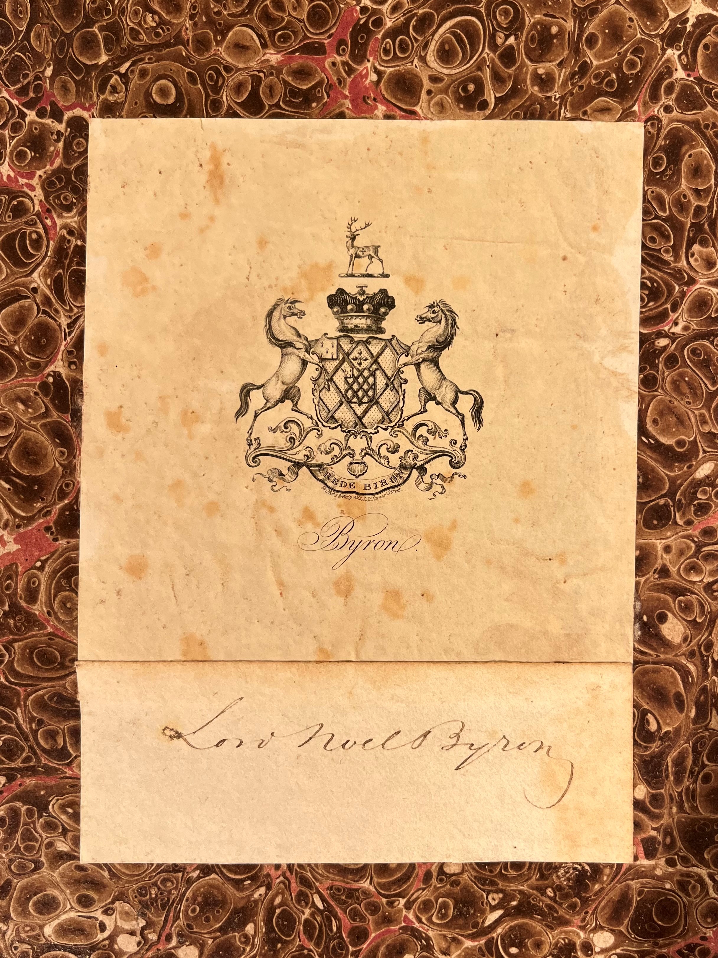 Bologna, per Gamberini, and Parmeggiani, 1819-1821. In 4°. 3 vols. 295 x 210 mm. Oval portrait of the Poet on the frontispiece, 101 copperplates by Giovanni Giacomo Macchiavelli illustrating the various Canti, slight marginal foxing, tear on pg.15 without loss, SPLENDID CONTEMPORARY BINDING IN SPONGED CALFSKIN, smooth spine decorated in gold, title on red and green label. On the back cover EX LIBRIS BY LORD BYRON , with signature underneath. On the first flyleaf the story of the present copy is told, donated by Lord Byron in Genoa to the father of the then owner before Byron left for Greece in 1823.