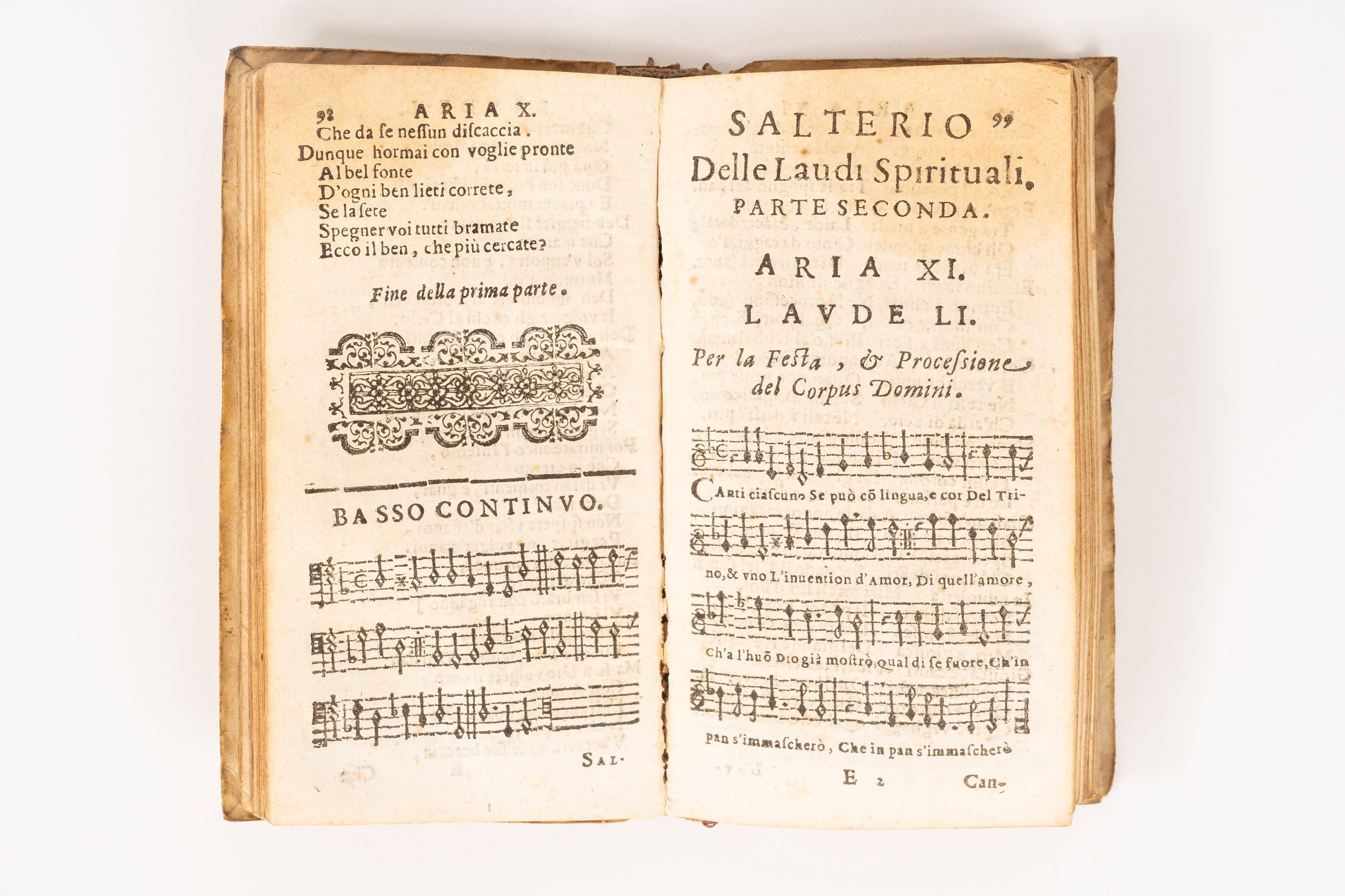 Turin, Lodovico Pizzamiglio, 1629. In 12°. The text begins with its own title page on f. A1 with the title: Sa Title page in woodcut frame, numerous examples of musical scores, slight stains, scattered foxing. Contemporary full parchment binding, manuscript title on the spine, small gaps.