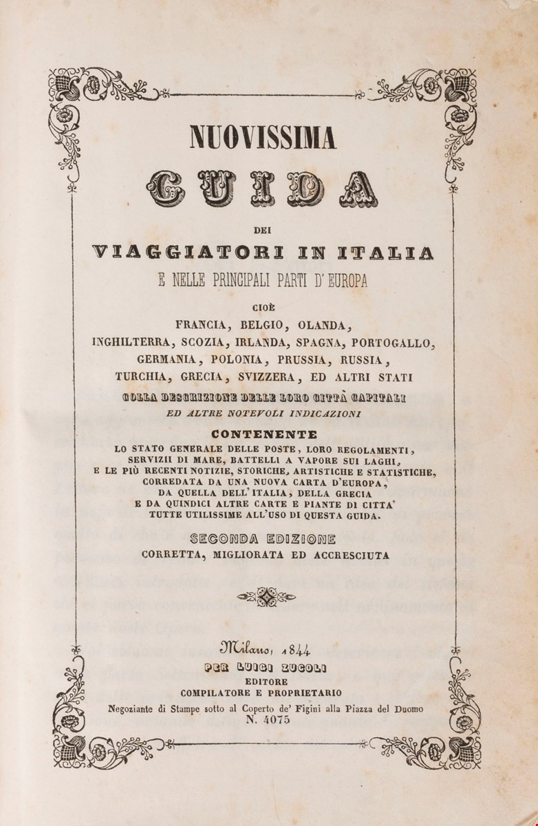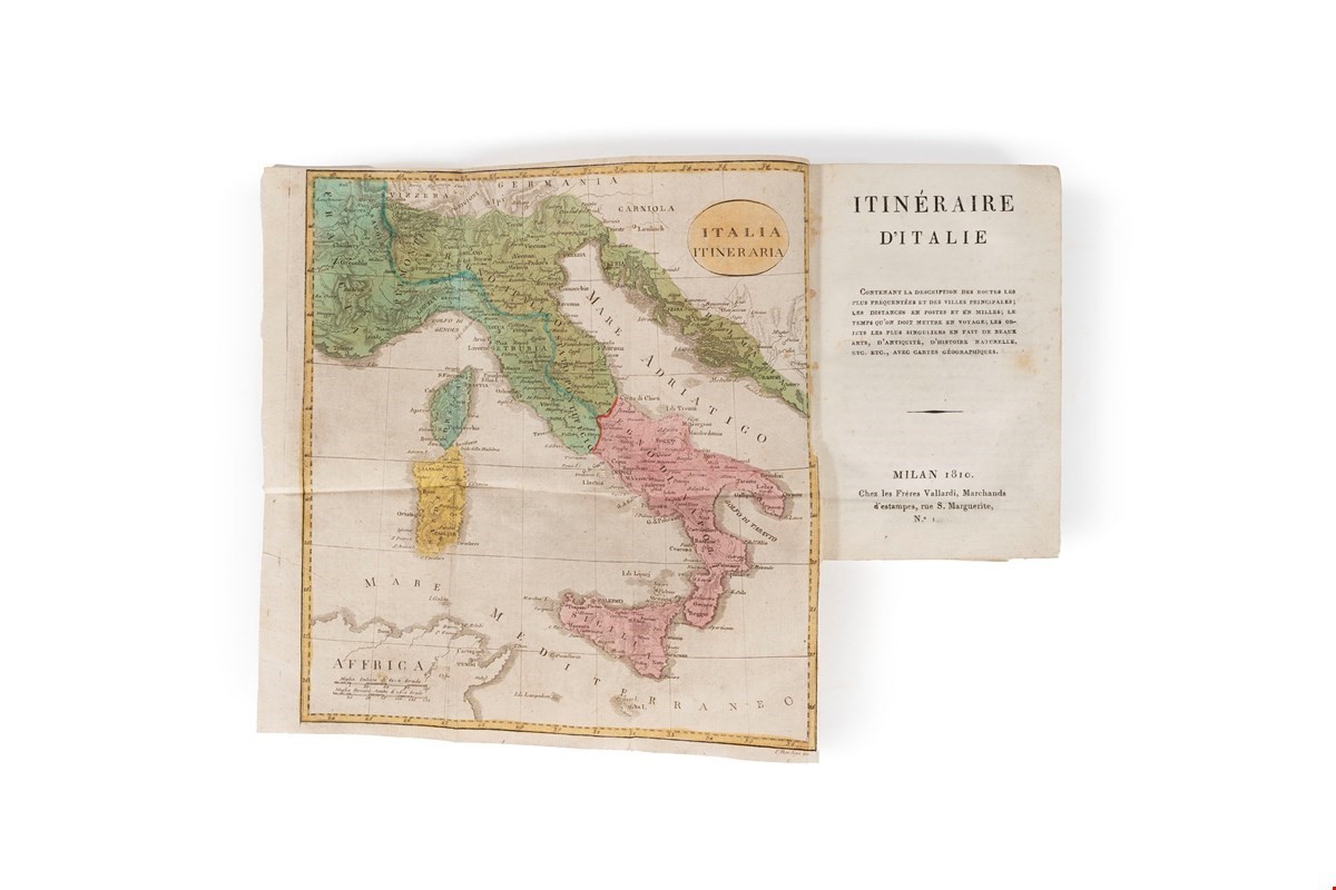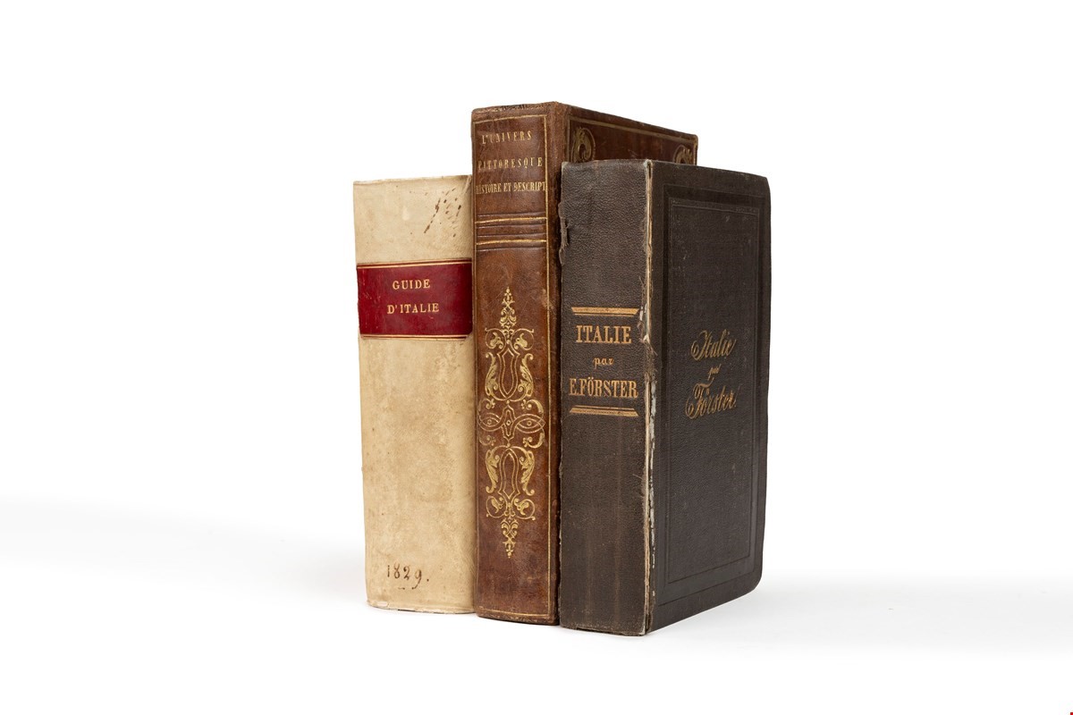 Lot containing 80 printed guides and publications dedicated to travel and itineraries in Italy , mostly in Italian, most accompanied by itinerary maps, plus a precious manuscript guide by Antonio Giachi enriched by 14 splendidly water-coloured trips and a manuscript travel diary by Lord Byron's nephew . The authors are those known for the genre: Giuseppe Nave, Domenico Boccolari, Franz Schott, Girolamo Franzini, Biondo Flavio, Giovanni Maria Vidari, Giuseppe Tofani, Francesco Tiroli, Marius Bernard, Pasquale Agnelli, Carlo Barbieri, MIchelangelo Prunetti, FRncesco Tiroli, Lorenzo Baroni etc.