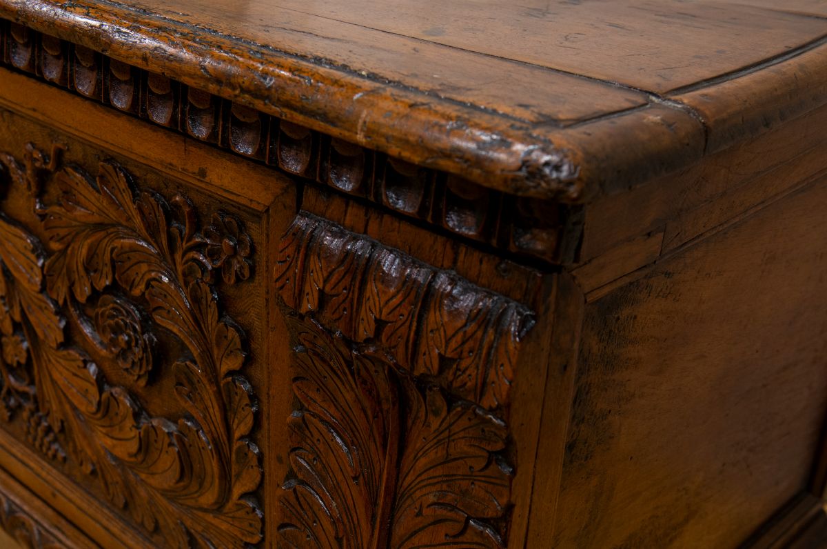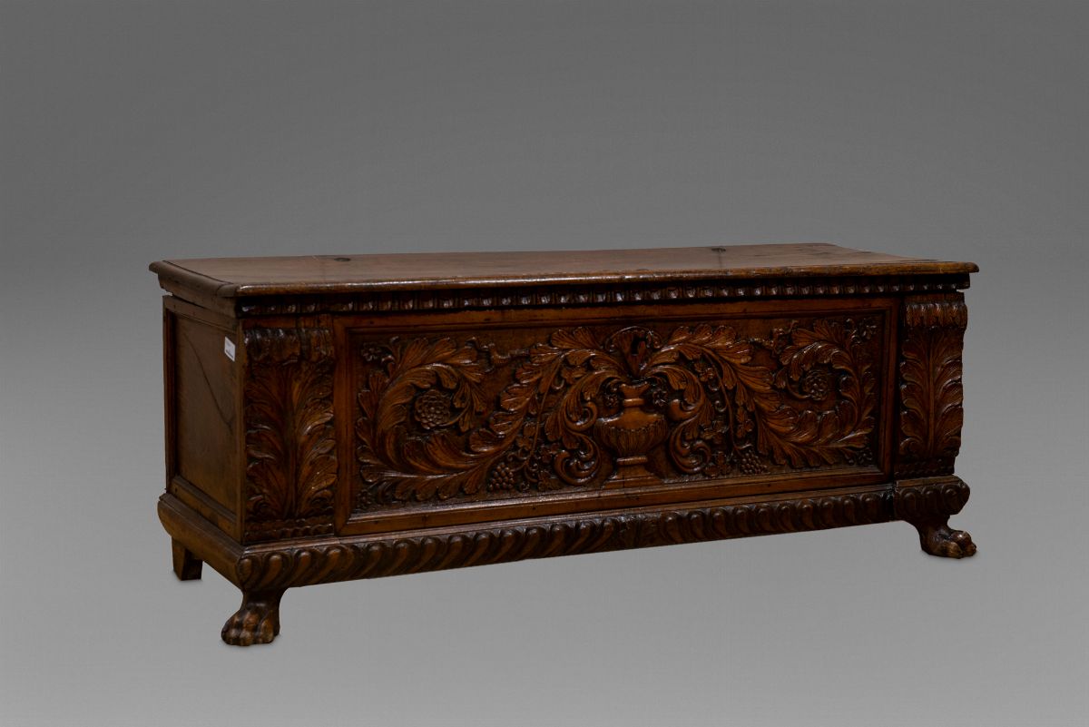 Beautiful chest in richly carved walnut, with pods, with vase on the front and lion's legs, 16th century