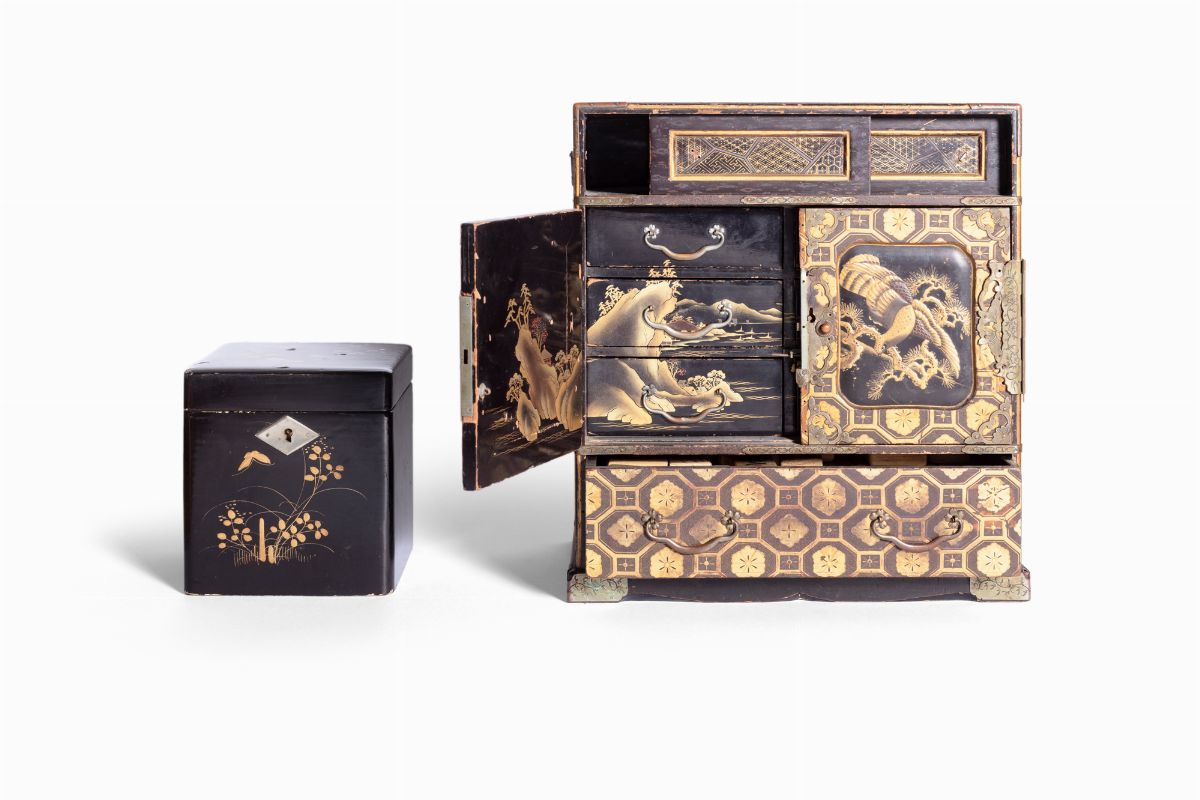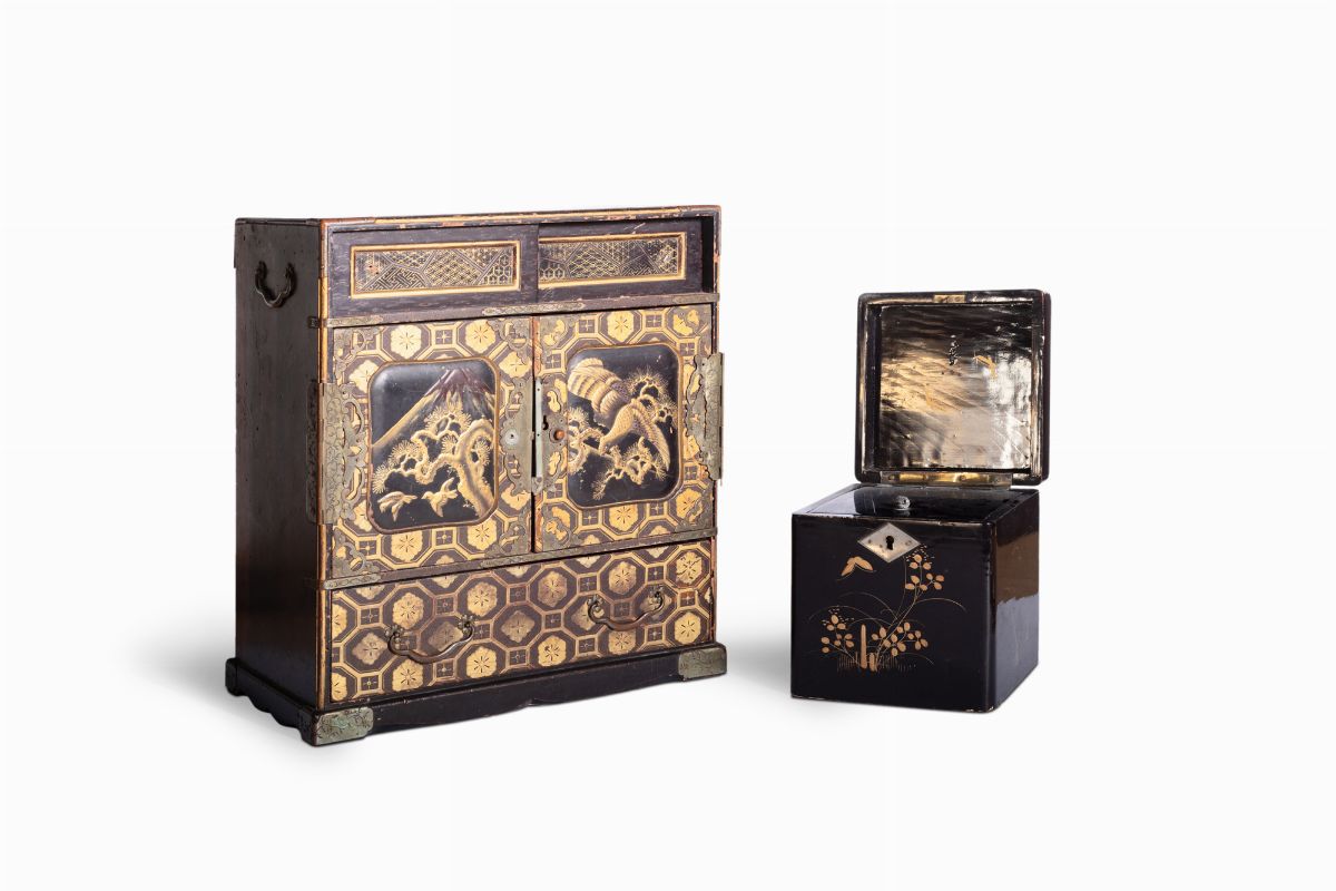 Black lacquer cabinet with gold geometric decorations, Japan Meiji period; and rectangular box in black lacquer and gold decorations, Japan circa 1920