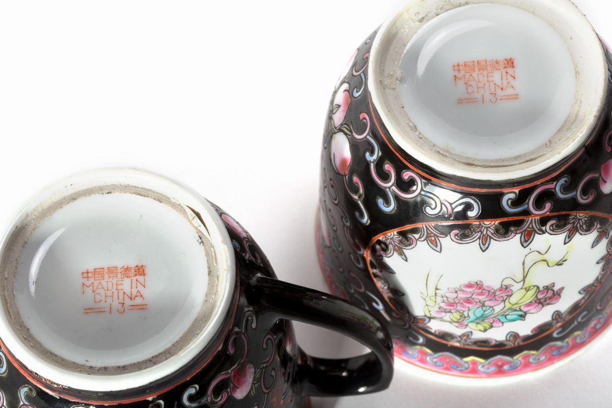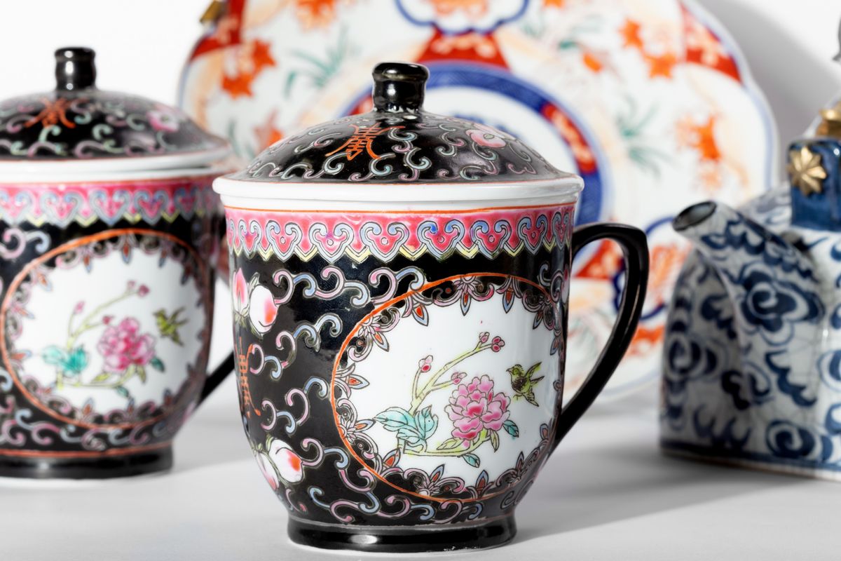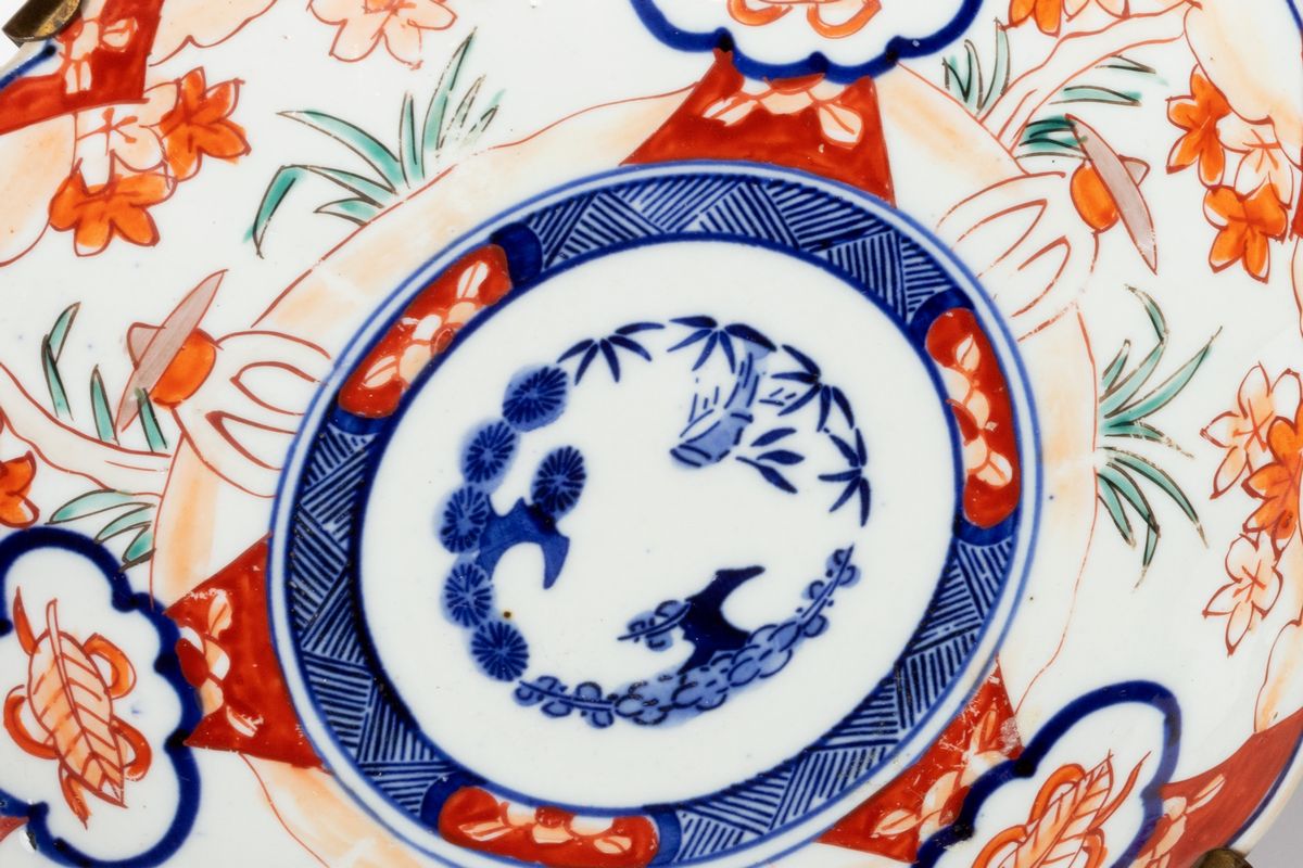 Lot of oriental porcelain: two teapots, two cups with lids and two Imari plates, 20th century