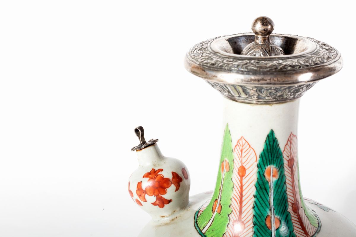 Polychrome porcelain kendi with floral motifs, with silver cap, China Qing dynasty, Kangxi period
