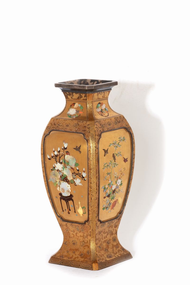 Pair of Shibayama vases in red lacquer, with mother-of-pearl inserts, semi-precious stones and...