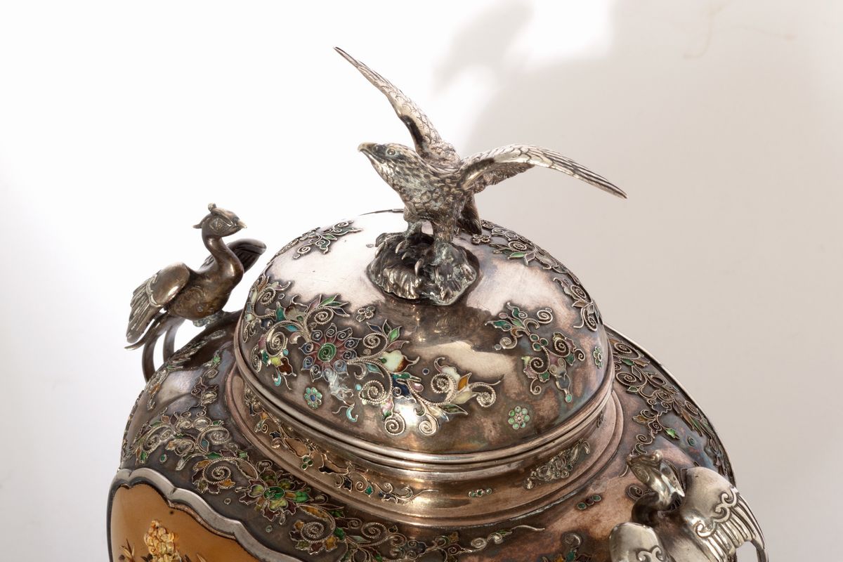 Shibayama tray in silver with perforated edge and inserts in mother-of-pearl, semiprecious stones...