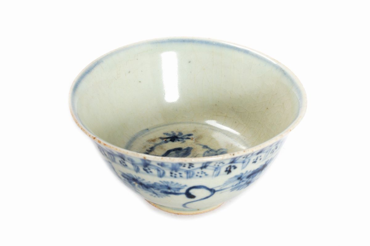 Blue and white porcelain bowl with floral and geometric pattern, China Ming - Qing period