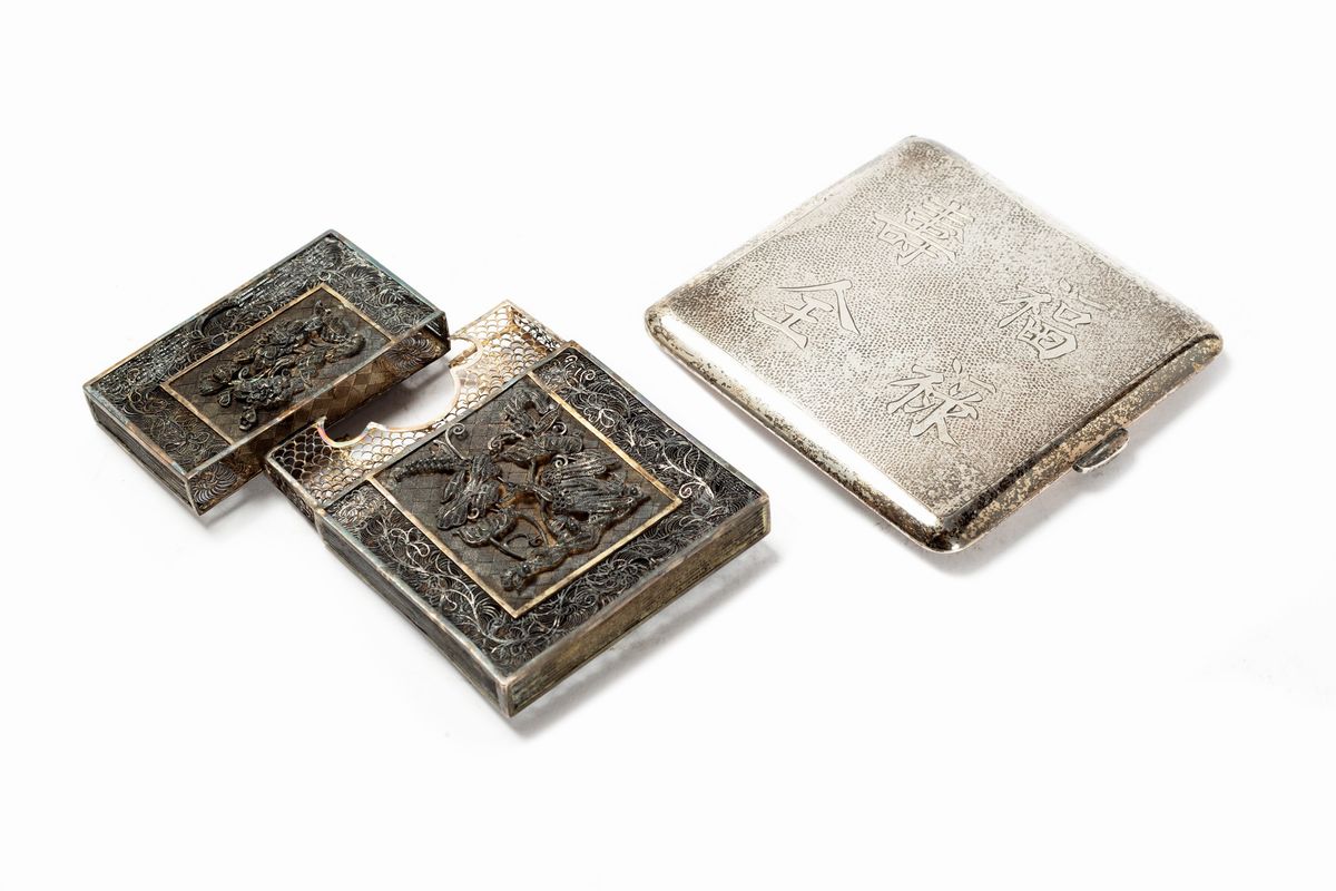 Lot consisting of a silver cigarette case and a silver filigree business card holder, China, 20th century