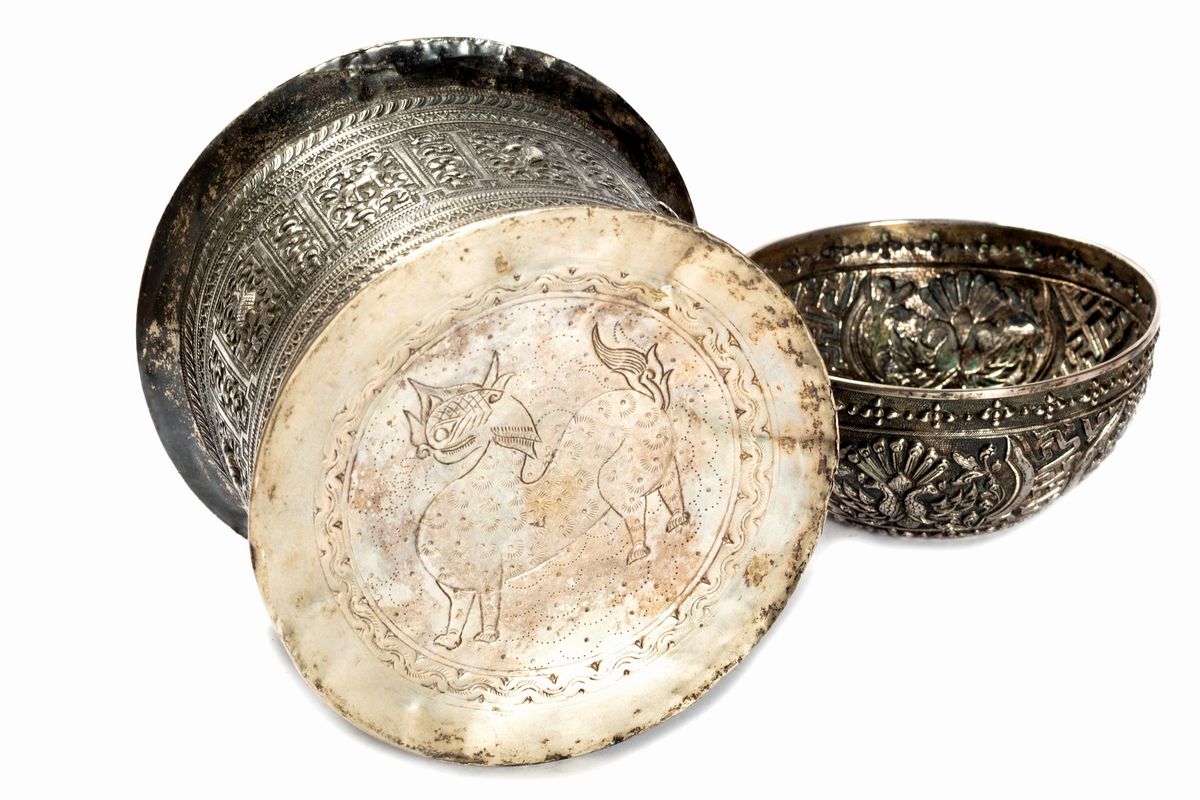 the largest box and the cup are in silver, engraved and embossed with zoomorphic and phytomorphic motifs
