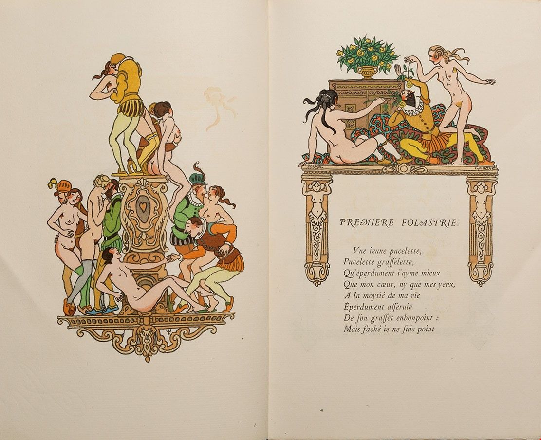 Roma, Editions de la Roseraie, 1945. In 8°. Brossura originale conservata entro legatura moderna in mezzo marocchino avana e cofanetto. Esemplare n.46/500. § Charles Baudelaire. Les Fleurs du mal. Parigi, La belle edition, [1950 ca.] In 8°. Illustrata da Edouard Chimot, brossura editoriale. Esemplare intonso, n. 1691/3500. § Ianot Parisien. Livret de folastries. Parigi, Librairie Lutetia, 1924. In 4°. Illustrazioni opera di Joseph Hemard, brossura editoriale. Insieme nel lotto altre 5 edizioni di classici della letteratura erotica.