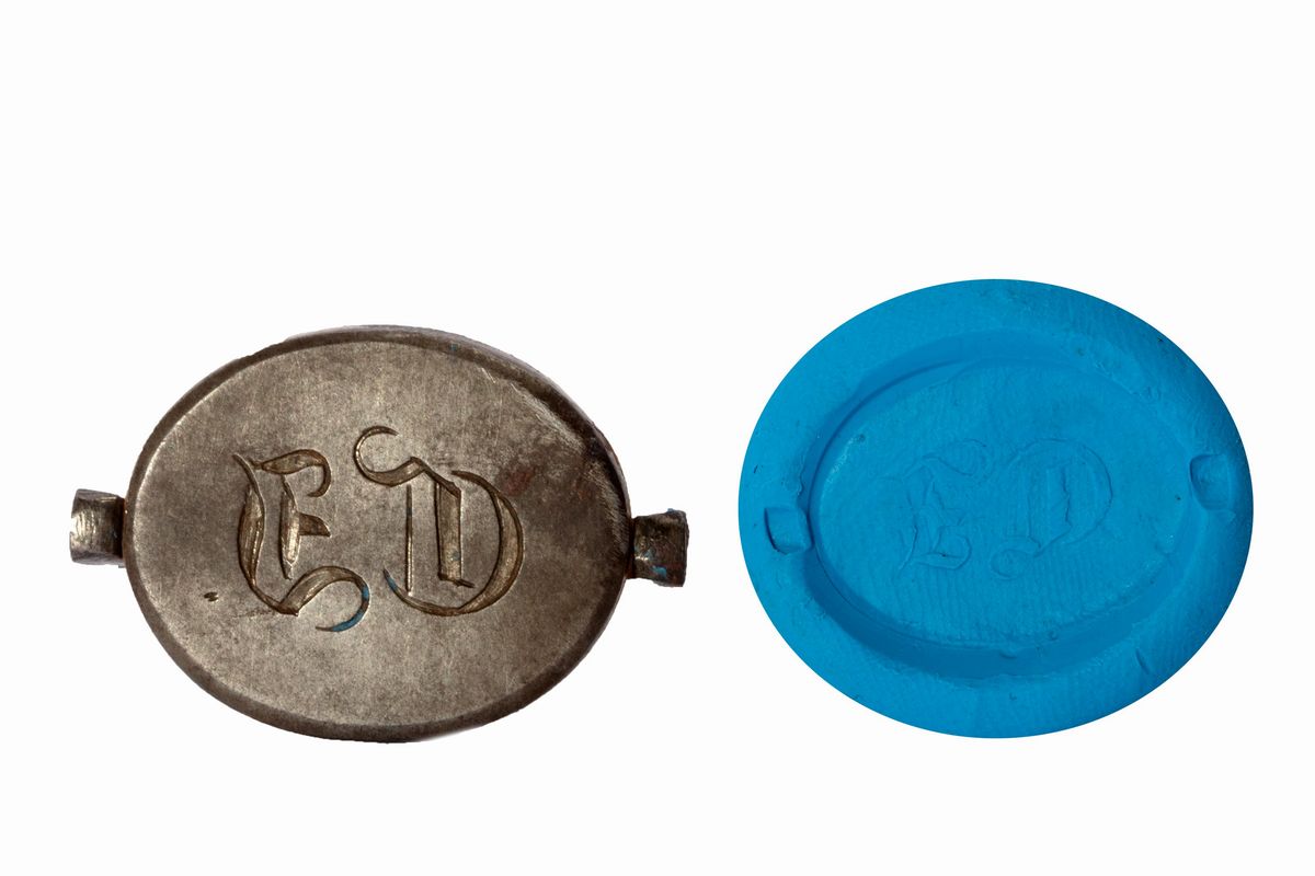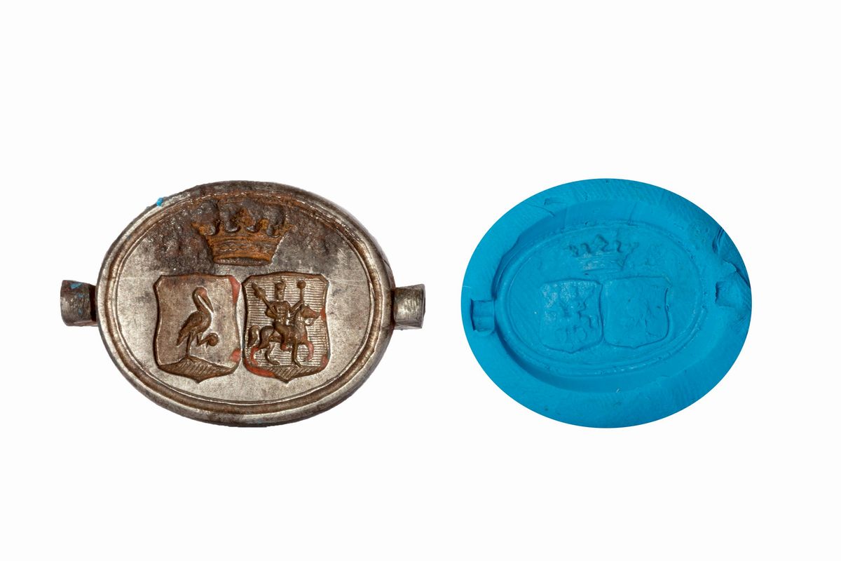 Iron pendant seal with noble coat of arms on the front and ED monogram on the reverse, inside original leather case, late 18th century